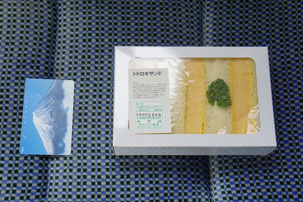 余目駅で買えた、箱入りサンドイッチ。駅舎に入居した喫茶と売店の機能を持つ店舗「あまるめホッとホーム」で売られていた。商品そのものは2017(平成29)年の年末までに駅前で発売か。大阪や東京から近年は全国に流行中のタマゴサンド、玉子焼サンドの、やや辛子が多めなものが3切れ、透明のトレーに詰めて白い紙箱に収まっていた。2025年の訪問時、店舗は駅舎から退出し、少し先の建物へ移転していた。この商品が現存するかは不詳。