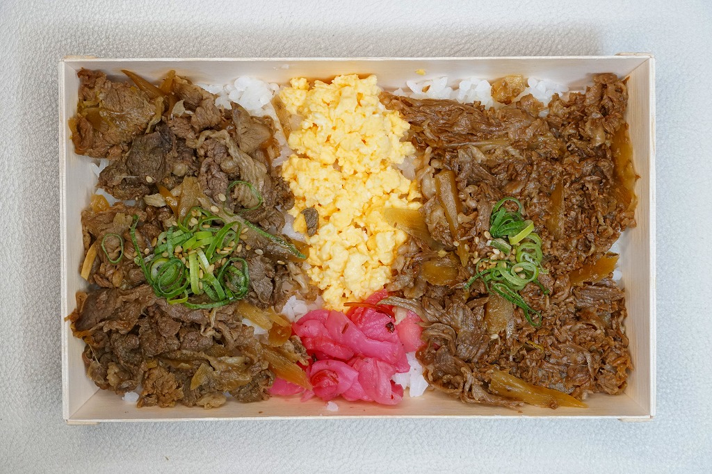 長方形の木質エコ容器に白飯を敷き、米沢牛の牛肉煮、馬肉煮、玉子そぼろ、漬物で覆う。肉の色と味付けがとても濃く、ブランド牛かどうか、牛か馬かも分かりにくいくらい、クセがなくて食べやすい、そぼろ丼のようなお肉の弁当。「米沢牛ローストビーフ&馬肉あい盛り弁当」も、容器と掛紙は同じだった。会場に掲示されたポスターによると、調製元は山形県長井市内でも今泉から約10km離れた焼肉店「やき肉黒獅子」とみられる。