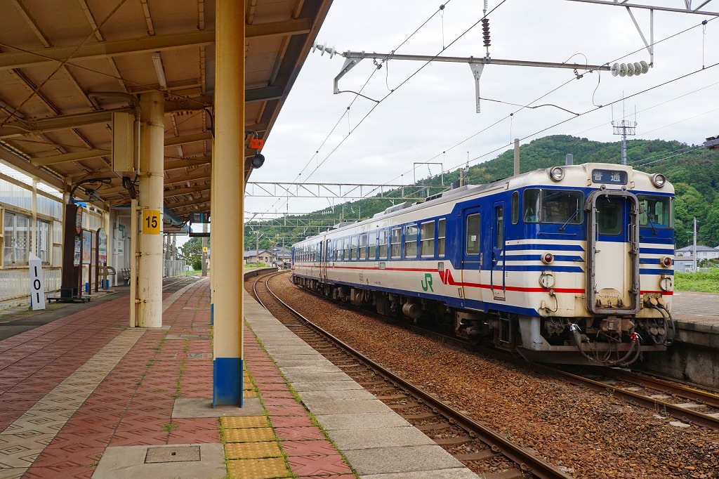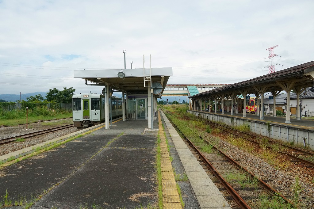 酒田駅からも鶴岡駅からも普通列車で20分弱。庄内町は山形県の日本海側の庄内地方で鶴岡と酒田に挟まれた、人口約2万人の町。この羽越本線が陸羽西線を分ける駅は、かつては公式な駅弁販売駅として、1930年代から1970年代まで酒田駅とも鶴岡駅とも異なる駅弁が売られた。1914(大正3)年9月20日開業、山形県東田川郡庄内町余目。
