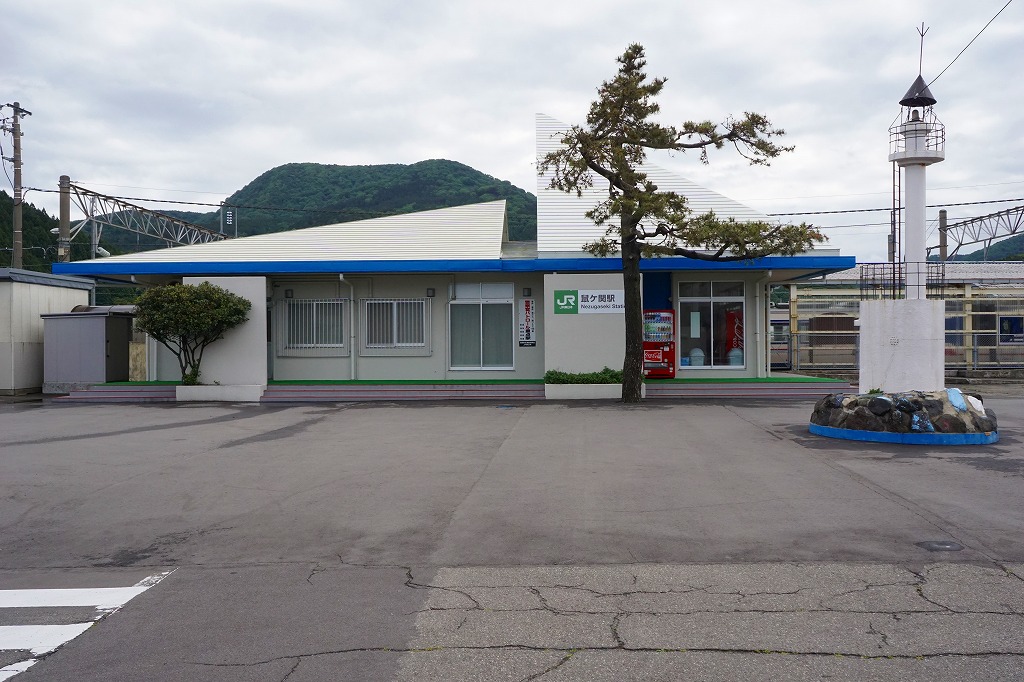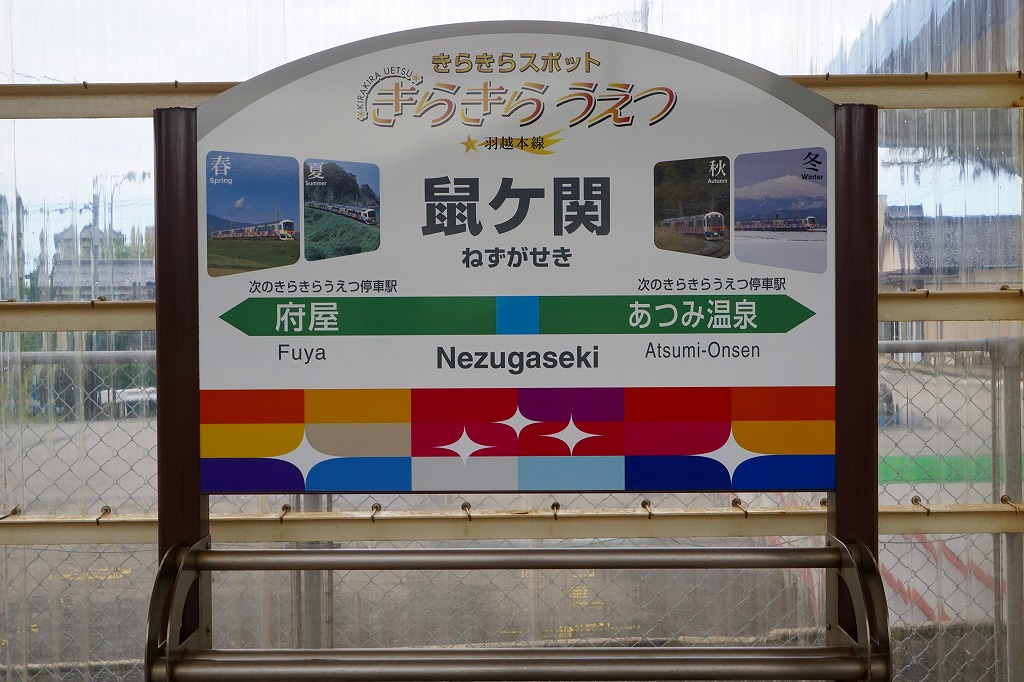 酒田駅から普通列車で約1時間半。鼠ヶ関は新潟と山形の県境、越後と出羽の国境にあり、古くは奥州の出入口となる関所であった。現在は普通列車しか止まらない小さな駅であるが、かつてここに機関車の車庫があり、1960年代には鶴岡駅の駅弁が売られた。1923(大正12)年11月23日開業、山形県鶴岡市鼠ケ関乙。