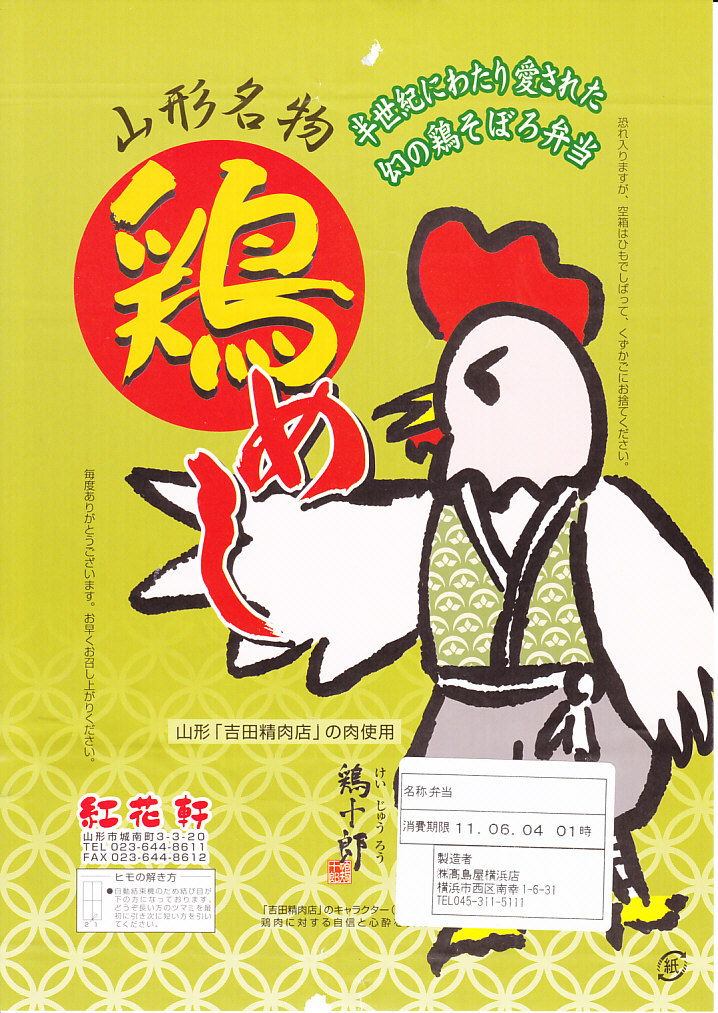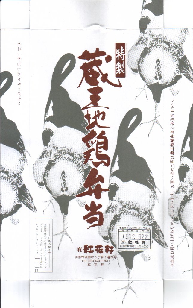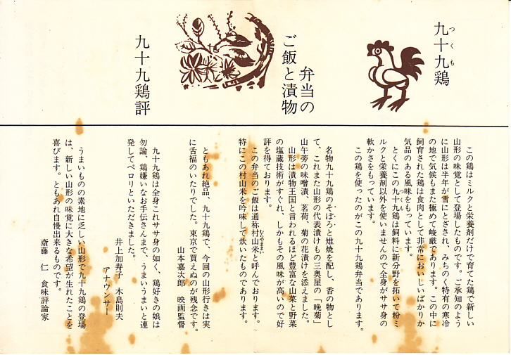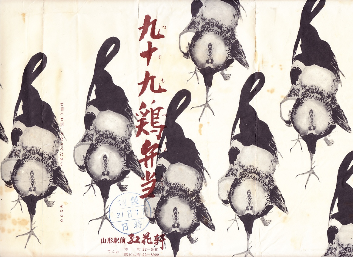 昭和40年代、1970年前後の、不明月21日6時の調製と思われる、昔の山形駅弁の掛紙。九十九鶏弁当は山形駅の名物駅弁で、山形で愛された弁当であった。当時の山形駅の駅弁屋であった紅花軒(こうかけん)が駅から撤退し、その現況がよくわからなくなった今も、上記のとおり復刻品が販売される。