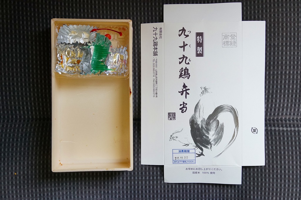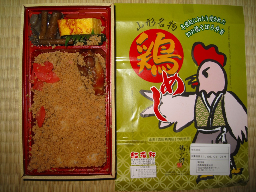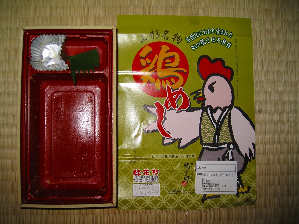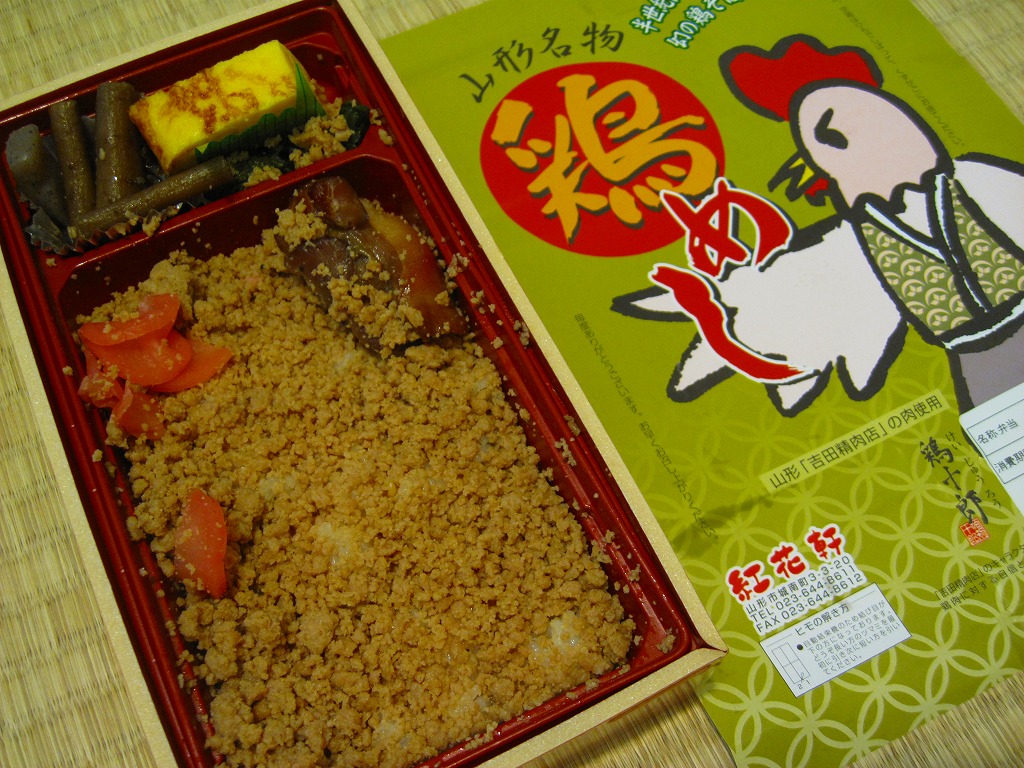 下記の「特製蔵王地鶏弁当」、つまり過去の山形駅弁「九十九鶏弁当」の、2011年時点での姿だそうな。名前と価格と見栄えはだいぶ変わったが、引き続き山形駅ビル「エスパル」1階で販売されているという。2017年11月の駅ビル改装を前に閉店した模様。