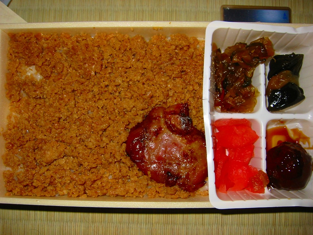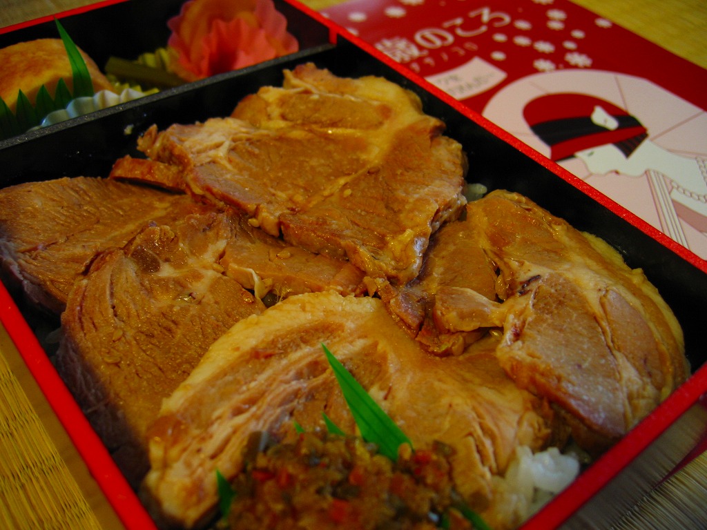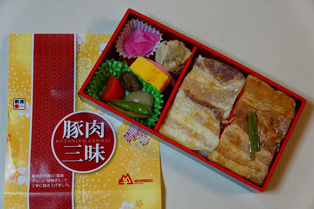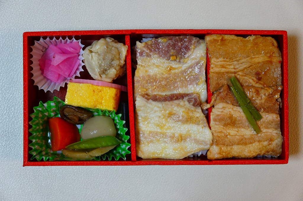 2017(平成29)年の夏頃の新作か。白御飯をしょうゆ味とみそ味の豚焼肉で覆い、肉しゅうまい、かまぼこ、玉子焼、こんにゃくなどの煮物、大根桜漬を添える。過半が脂身の異様な豚肉は、この駅弁の仕様なのだろうか。タレの強い味も借り、臭みや固さはなかった。