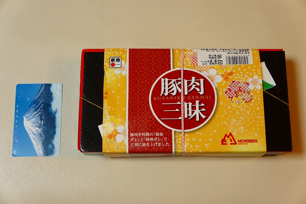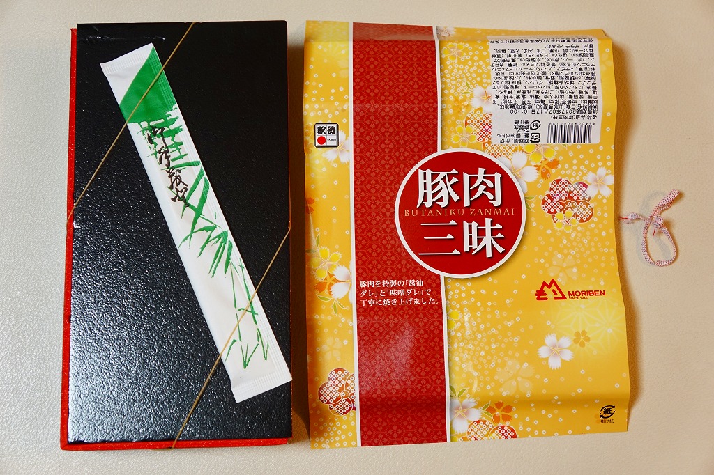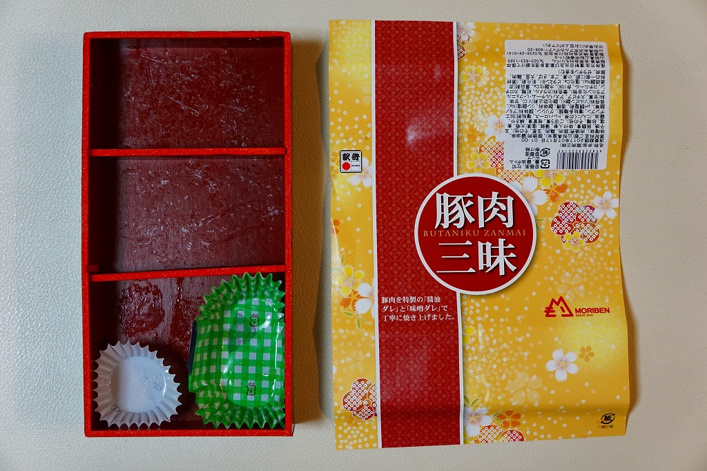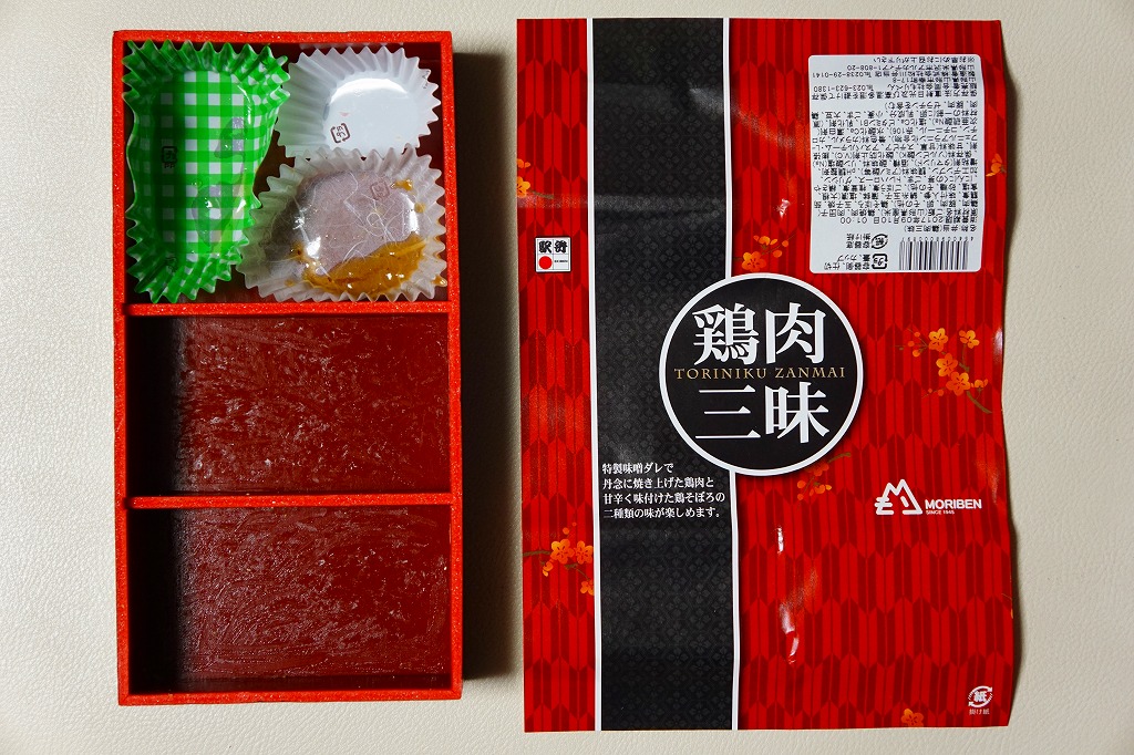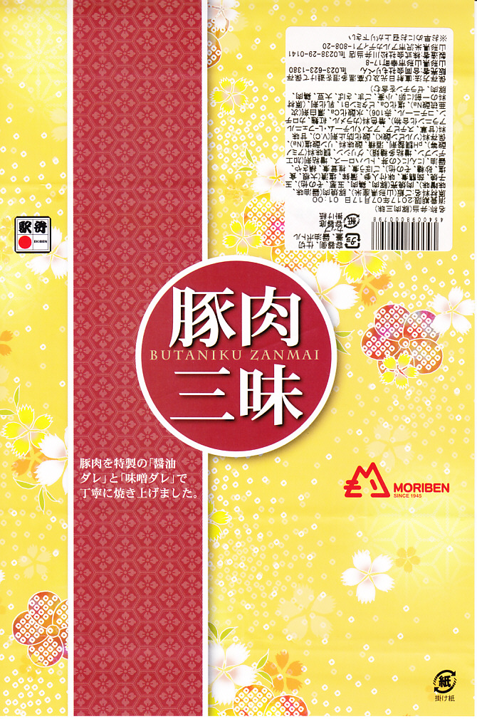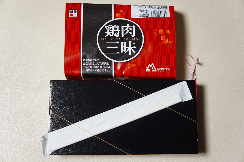 下記の駅弁「豚肉三昧」の姉妹品に見えるので、これもまた2017(平成29)年の夏頃の新作か。「牛肉三昧」という駅弁も出ている。容器が同じ、掛紙のデザインも同じ、おかずもほぼ同じ。東京駅で買ったら「販売者:合同会社もりべん」「製造者:株式会社松川弁当店」というのも同じ。