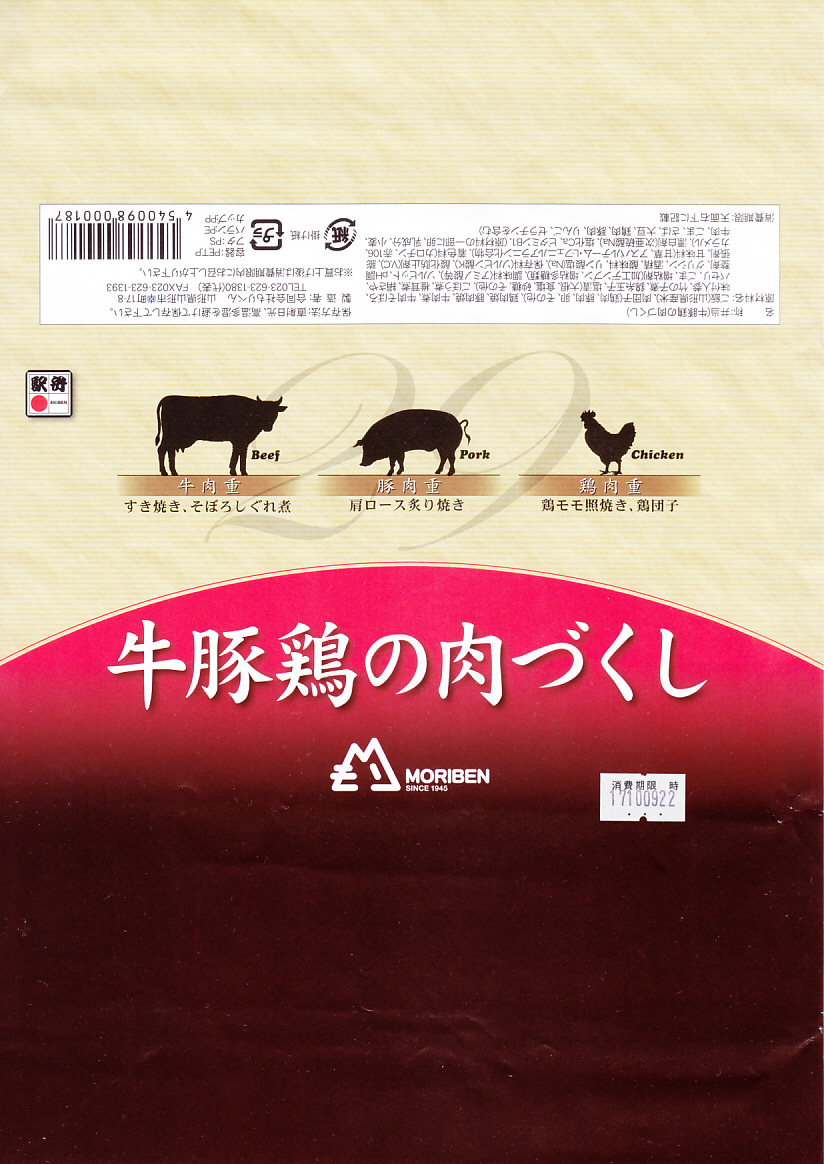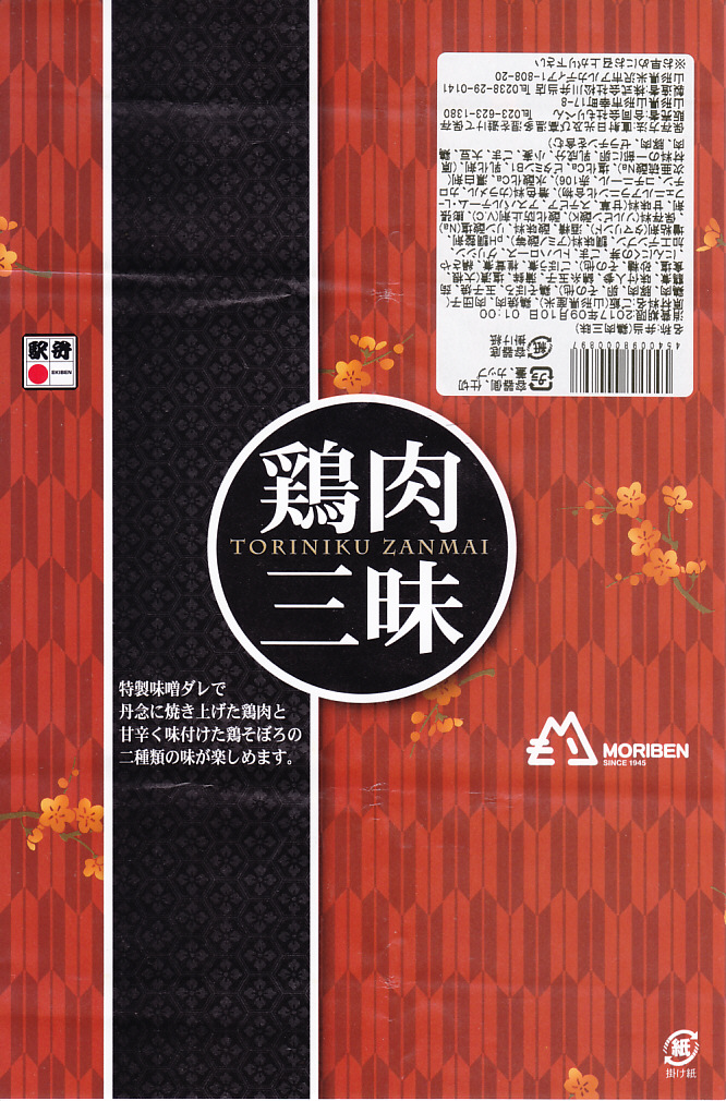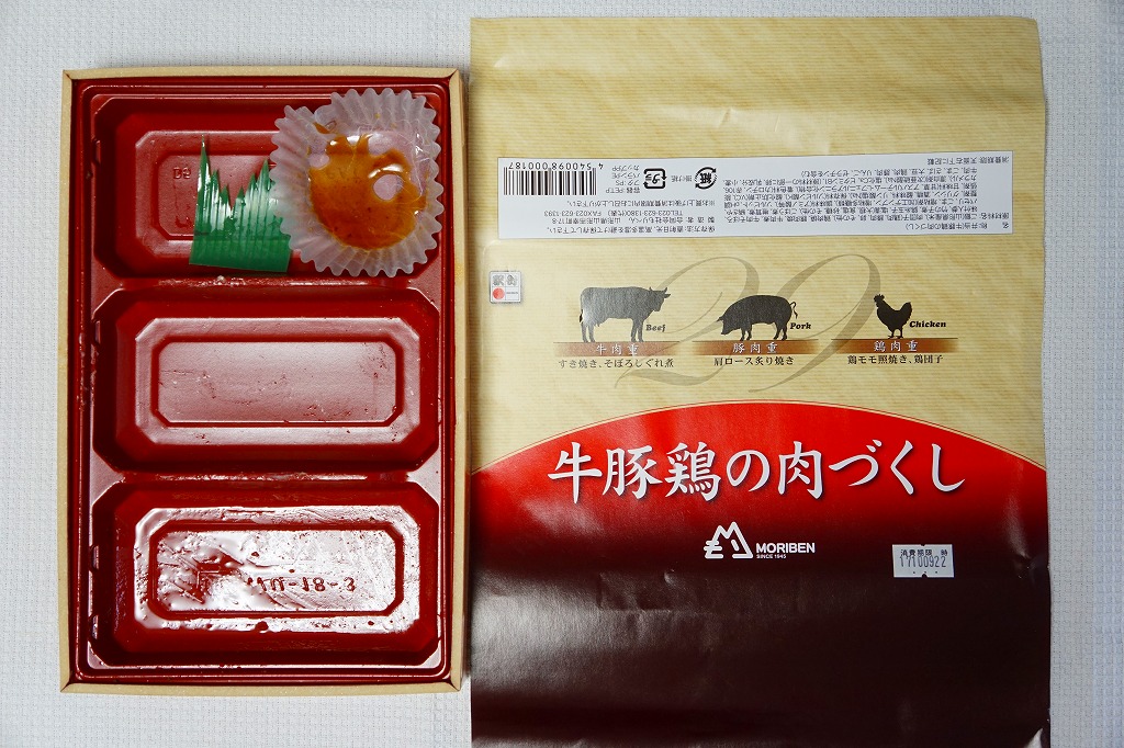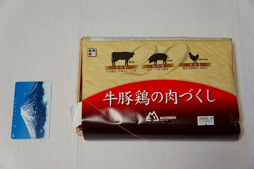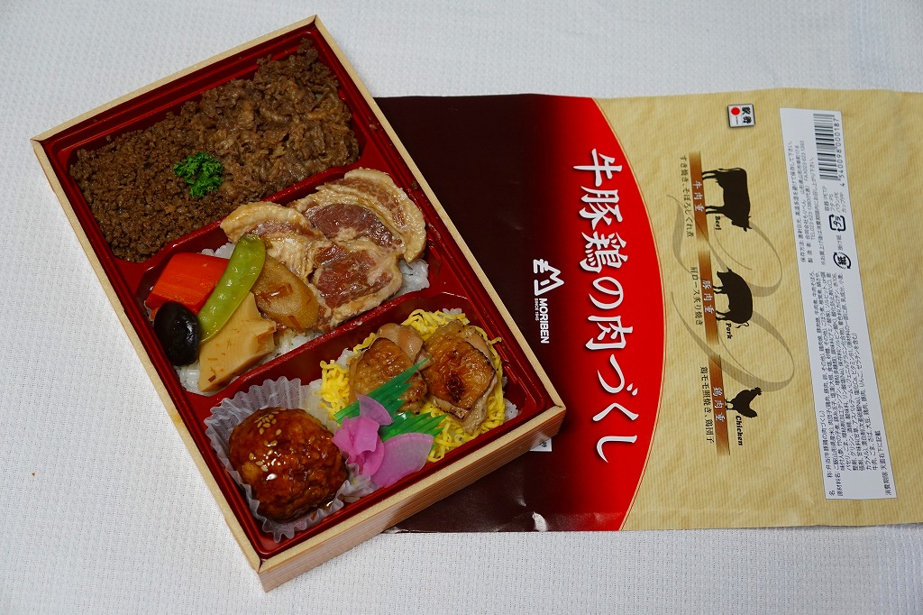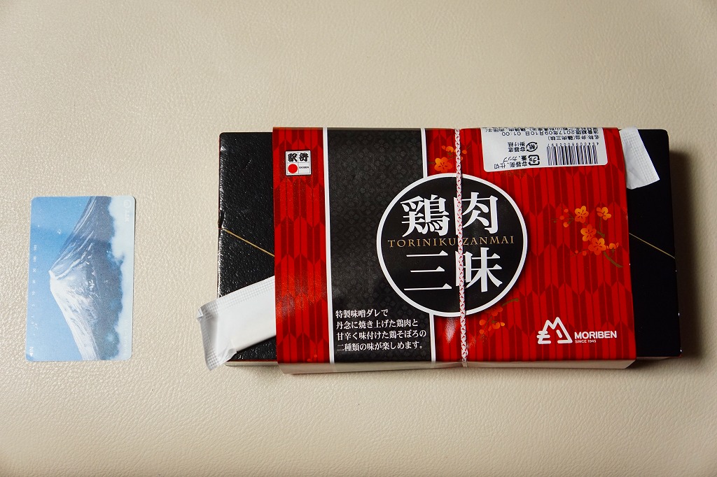 下記の駅弁「豚肉三昧」の姉妹品に見えるので、これもまた2017(平成29)年の夏頃の新作か。「牛肉三昧」という駅弁も出ている。容器が同じ、掛紙のデザインも同じ、おかずもほぼ同じ。東京駅で買ったら「販売者:合同会社もりべん」「製造者:株式会社松川弁当店」というのも同じ。