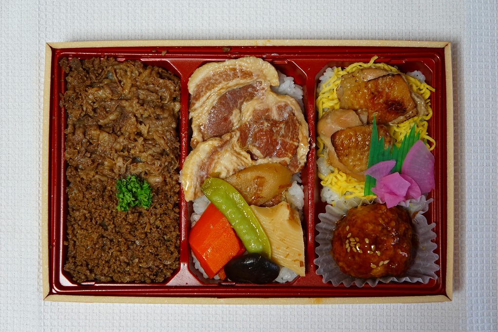 2017(平成29)年10月1日の発売か。同時に同年秋のJR東日本の駅弁キャンペーン「駅弁味の陣2017」にエントリー。駅弁の名前のとおり、容器の3区画に牛すき焼きと牛そぼろしぐれ煮の丼、豚肩ロース炙り焼き丼、鶏モモ照焼きと鶏団子の丼を詰める。