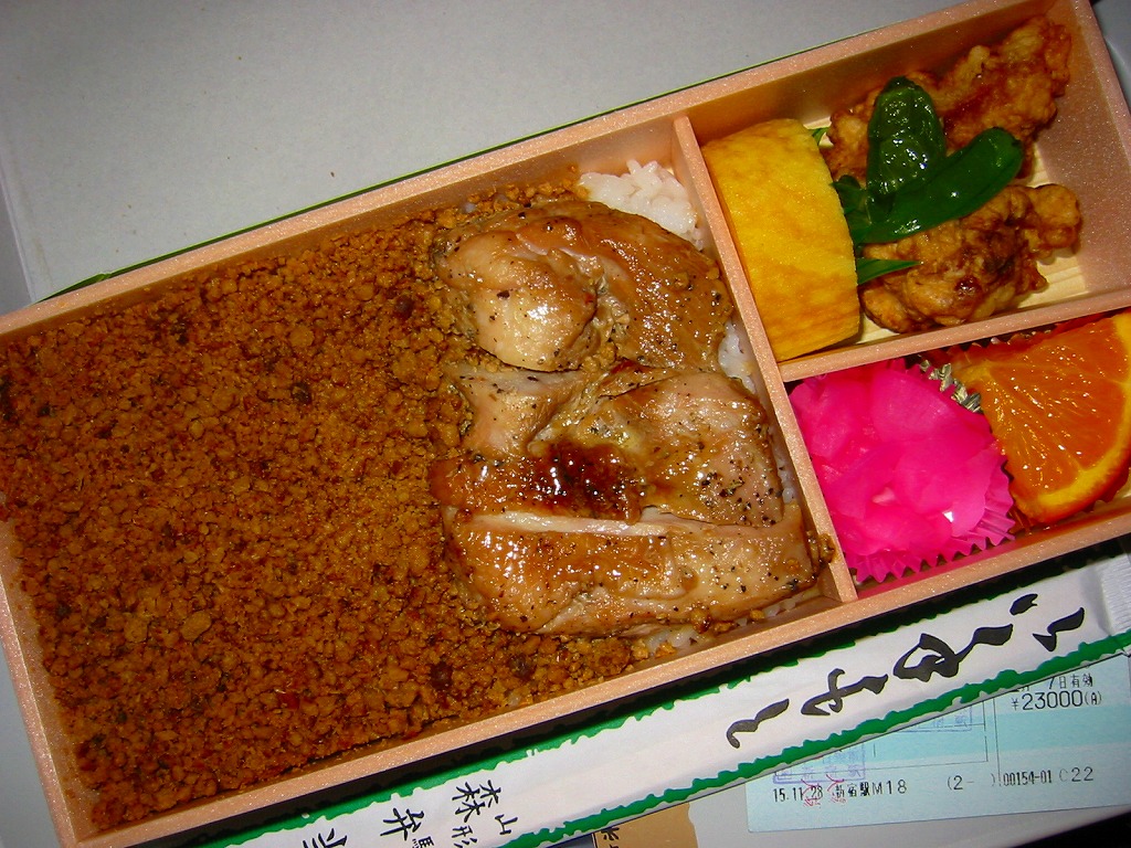 白御飯をとりそぼろと、焼き鳥と錦糸卵でそれぞれ覆い、肉団子、かまぼこ、玉子焼、こんにゃくなどの煮物、大根桜漬を添える。焼き鳥の肉が固い脂肪の塊であったものの、香りの良い鶏駅弁だった。2020年時点で3日前10個以上の予約販売という。2022年に終売か。
