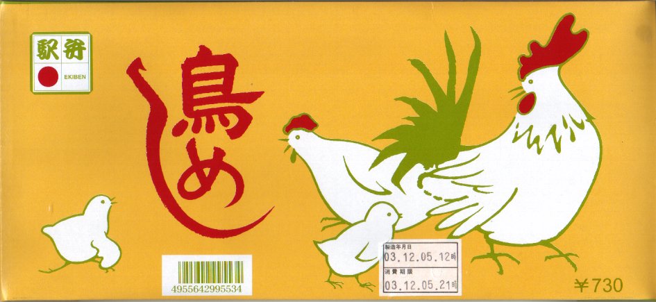 細長い長方形の容器に、古風に鶏とヒヨコを描くボール紙のふたをかける。中身は白御飯の上に鳥そぼろと鳥照焼を載せて鳥唐揚を添える鳥づくしな内容も、鳥そぼろは非常に甘ったるく、鳥照焼は逆にとても塩辛い、味覚が変になりそうな味付け。鳥唐揚は普通の醤油味であった。現存しないと思われる。