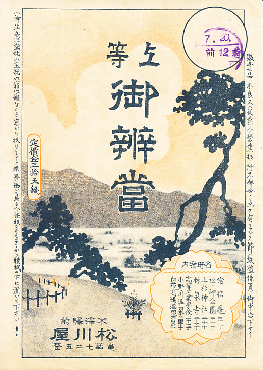第二次大戦前、35銭の価格からおそらく1920年代のものと思われる、昔の米沢駅弁の掛紙。名称と価格と調製元と注意書きと、風景と名所を描く、当時の駅弁掛紙の標準的な絵柄。松のある風景は、名所案内の2番目「松ヶ岬公園」か。つまり米沢城址のことで、米沢の中心市街地で現存し、サクラの名所として知られる。