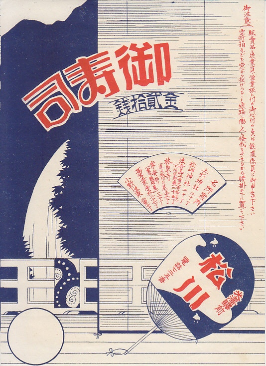 1920年代のものと思われる、昔の米沢駅弁の掛紙。絵柄は寺社の境内だろうか。名所案内を扇形に記した。