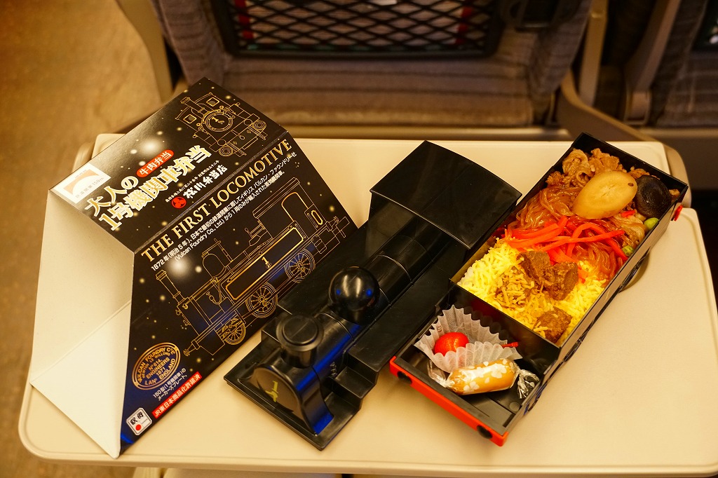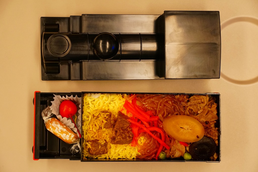 従前の1号機関車弁当と同じ、鉄道博物館に収蔵される1872年の日本の鉄道開業時の蒸気機関車を模したプラ容器を、ここでは商品名と蒸気機関車を描いた黒いスリーブにはめる。中身は白飯を、錦糸卵と糸こんにゃくと牛肉煮で覆い、しいたけ、ごぼう、紅生姜、グリーンピース、牛角切を載せ、スモークチーズとさくらんぼを添えるもの。牛角切と紅生姜は、蒸気機関車の燃料である石炭と、その燃える炎をイメージしたのだと。鉄道車両型容器の駅弁にありがちなお子様ランチではないけれど、「大人の」というほど大人向けでもなく、だれでも食べられそう。