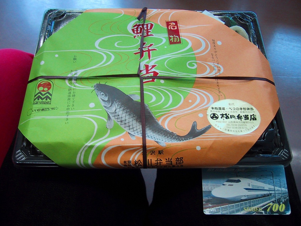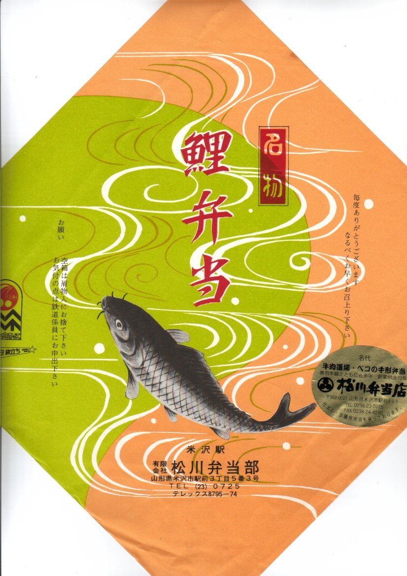 1899(明治32)年の発売という、伝統の駅弁。2000年頃で一日に5個限定や注文販売とされていて、2020年頃で2日前までの要予約とされる。記載の内容から1980年代の昭和時代や国鉄時代から変わらないと思われる掛紙が、大事に使われる。中身は、米沢の伝統食である養殖鯉を甘露煮にして入れ、あとは白御飯に里芋や椎茸やタケノコの煮物と切り干し大根など。価格は2002年の購入時で1,050円、2010年時点で1,250円、2014年時点で1,300円、2024年時点で1,380円。