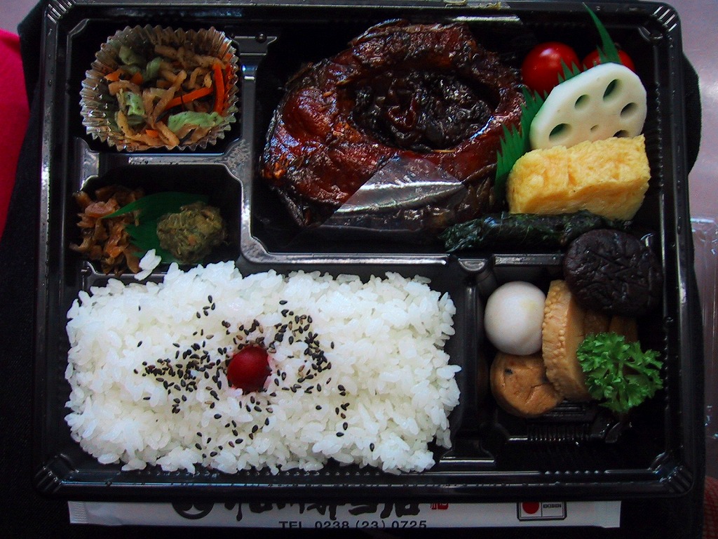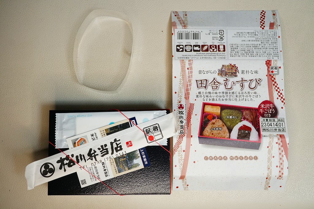 掛紙、容器、中身とも見栄えはとても良いが、中身は竹皮柄のボール紙で底上げされて半分が隙間である。山菜を探さないと見当たらない飯、その飯を青く染めるナス漬、苦みしかないふきみそと、どうしてこうなってしまうのかと思うガッカリ作。御飯そのものはおいしかったことが、せめてもの救いである。米沢駅で普段買えることは無いようだが、NREの東京地区での駅弁大会ではよく見掛けるレギュラー商品。価格は2011年の購入時で950円、2017年時点で春期販売の900円、2021年時点で950円。調製元公式サイトでは2日前までの予約販売旨書いてあった。2022年までの設定か。