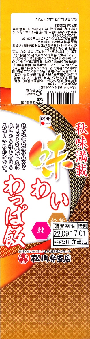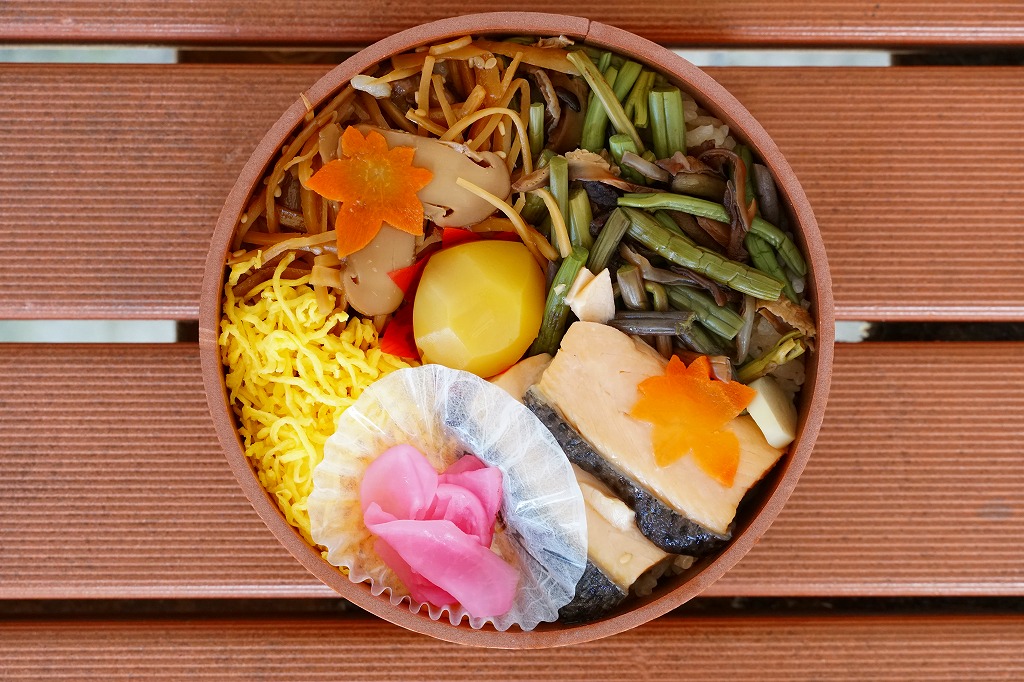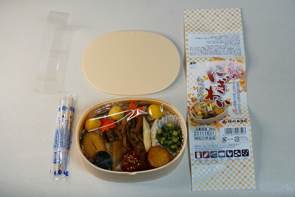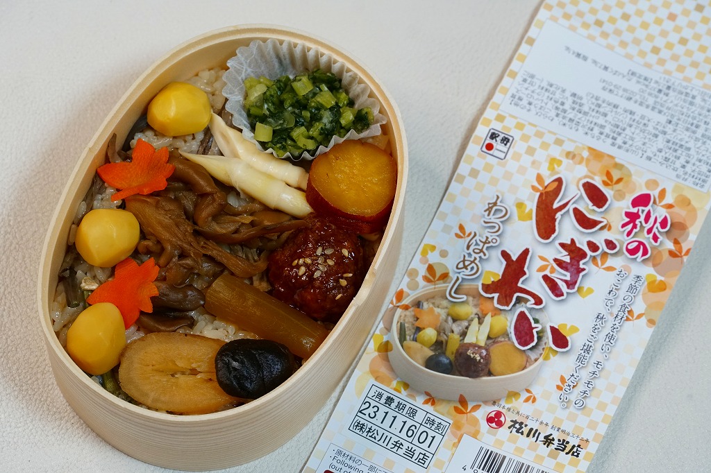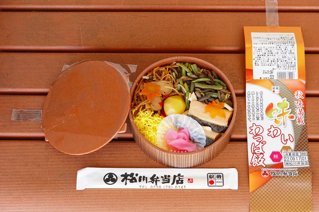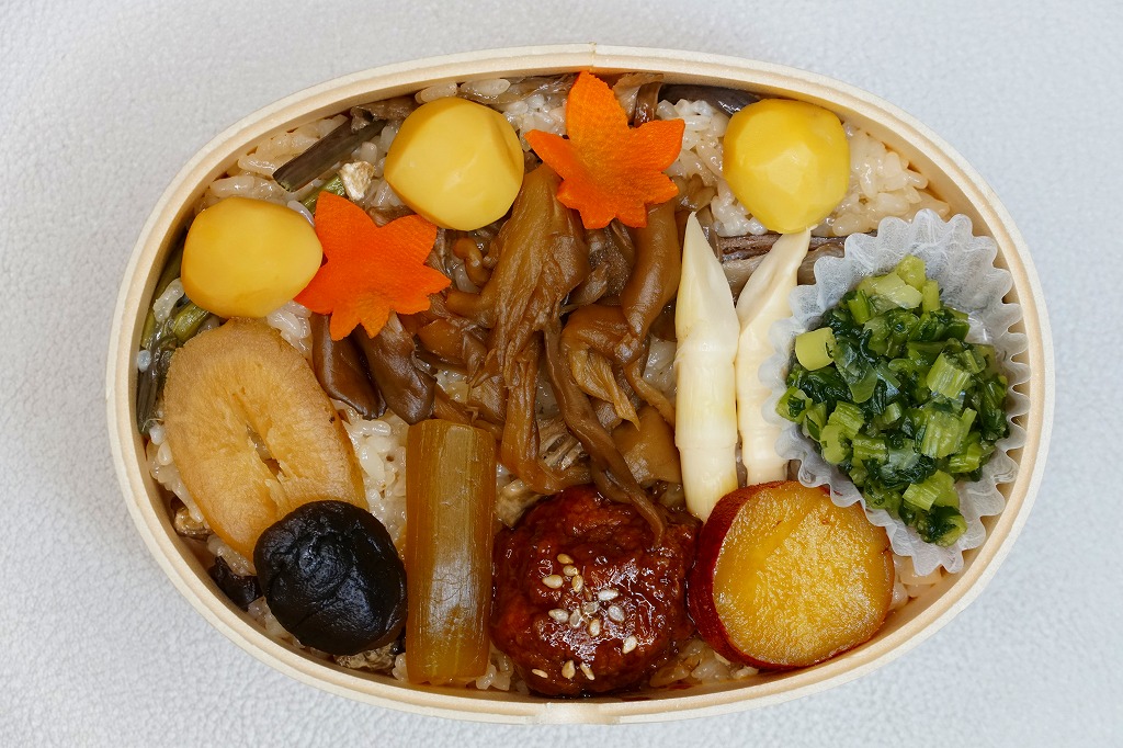 秋冬の駅弁大会シーズンに向けた、2020(令和2)年秋の新商品か。米沢駅でなくこのように、東京などにある各地の駅弁を売る売店か、駅弁大会で売られる弁当だと思う。真ん丸の容器に炊込みご飯を詰め、多くの山菜やきのこと、少々の鮭塩焼と栗で覆い、錦糸卵と大根桜漬で彩る。秋の弁当かと問われれば、そうだとは思う。価格は2020年の発売時で1,100円、2022年時点で1,130円。