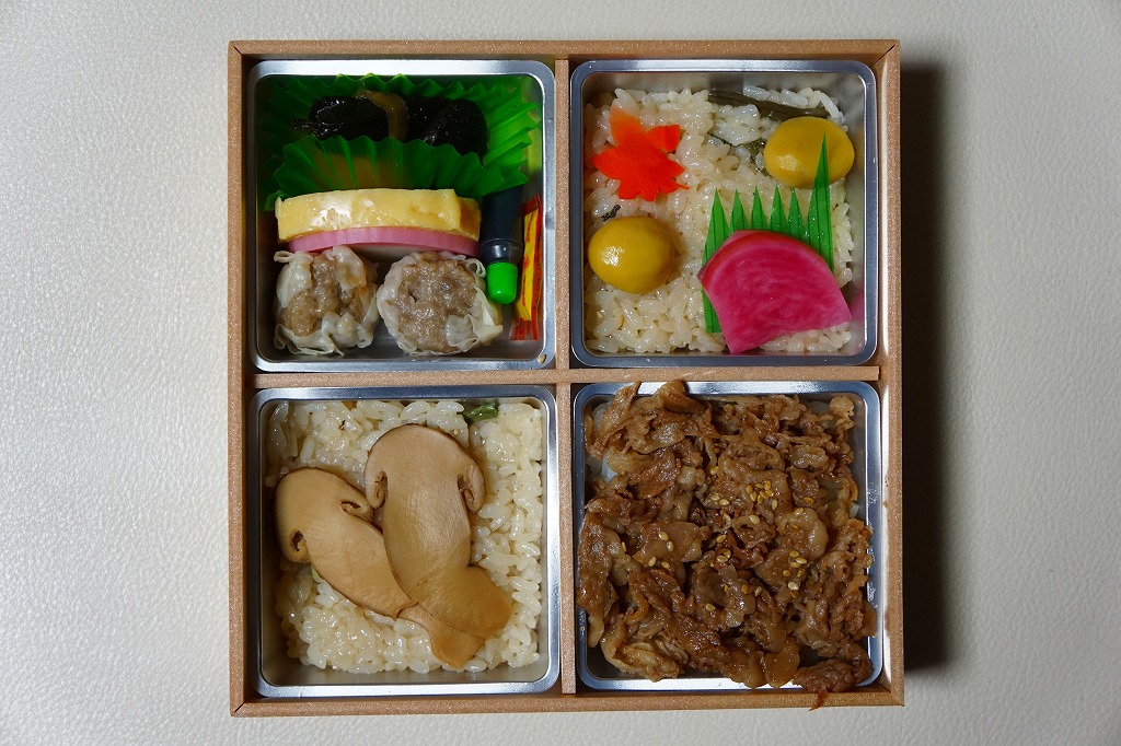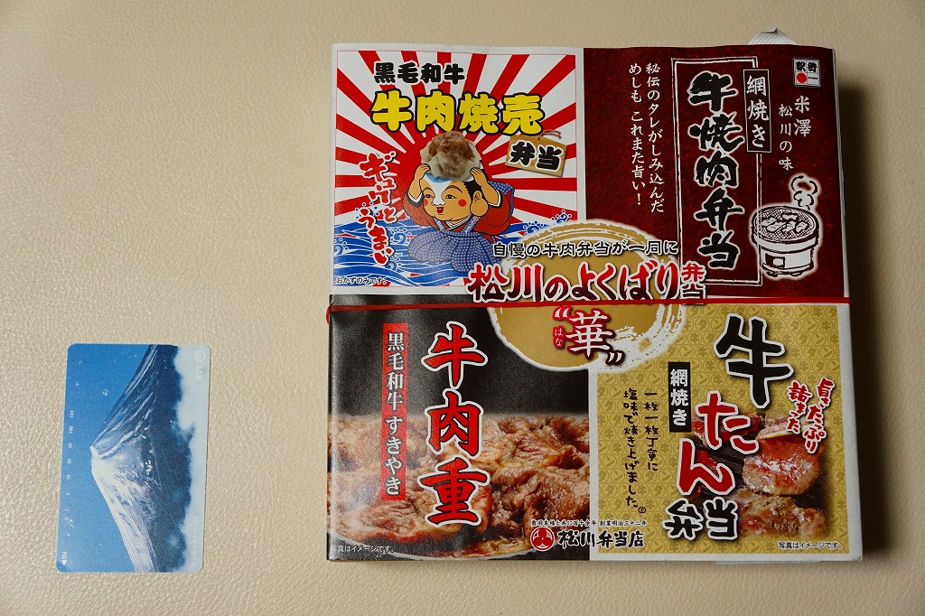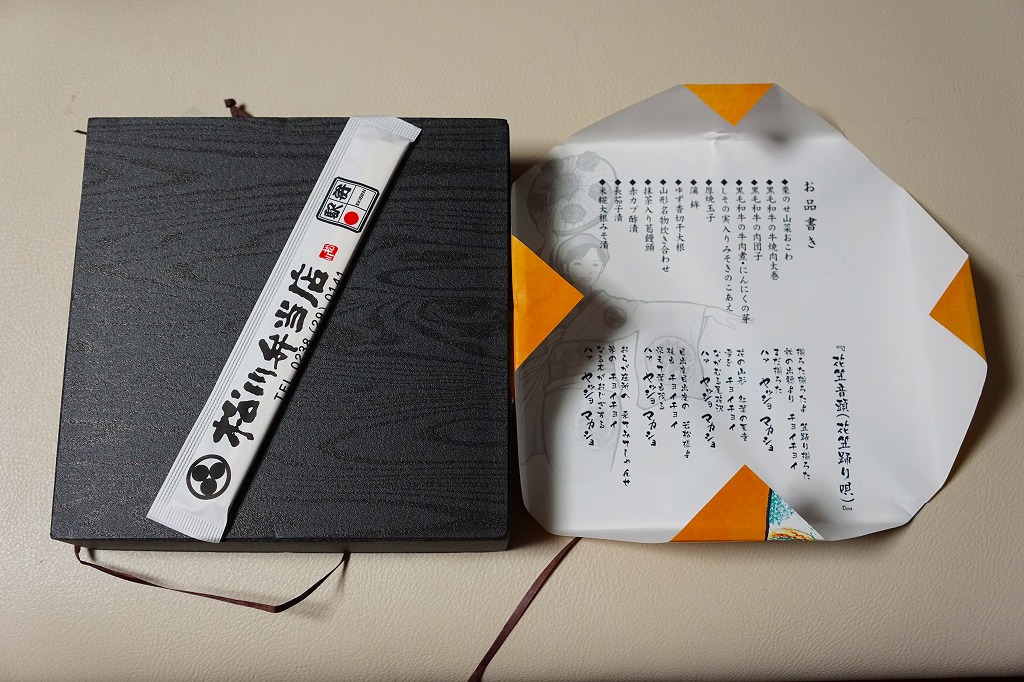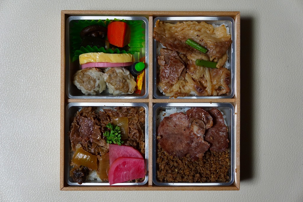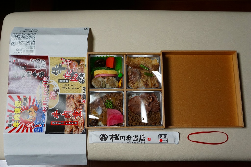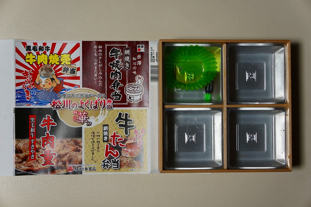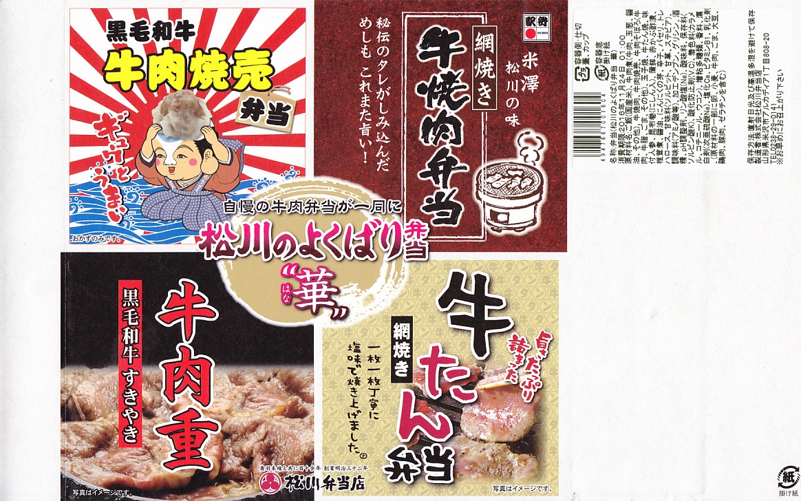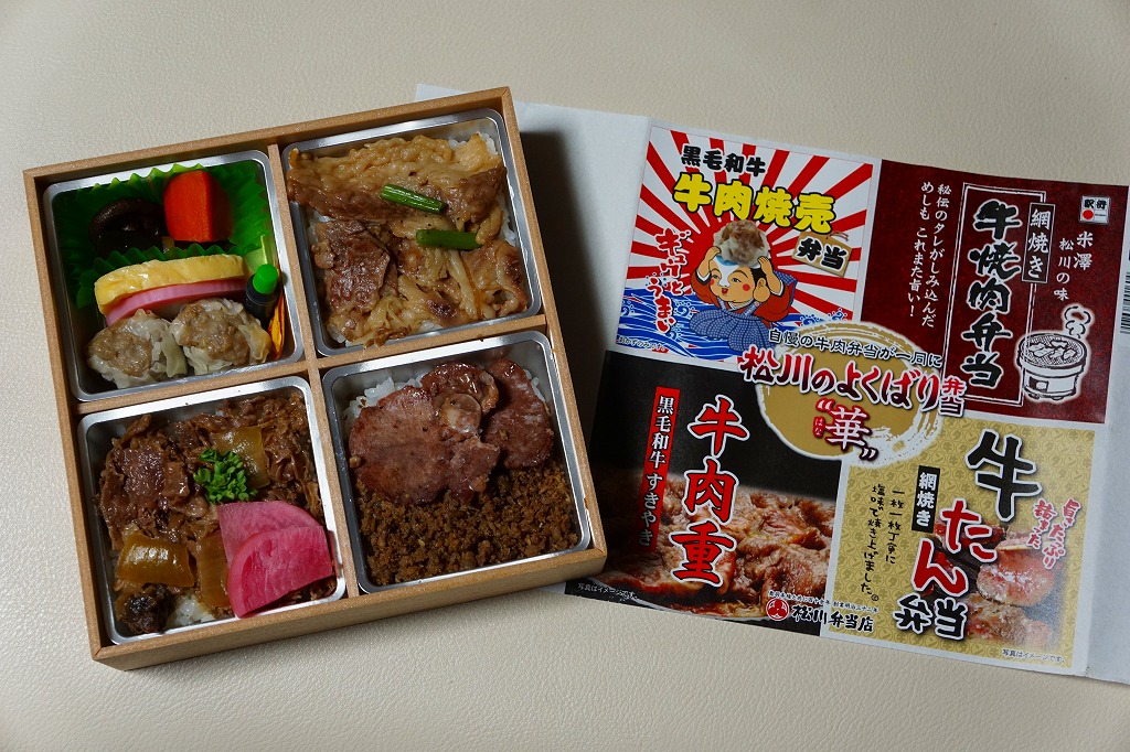 2016(平成28)年の11月から翌年2月までの販売か。当時に各地の駅弁屋の名前で登場していた、既存の4駅弁の組合せ商品の、米沢駅の松川弁当店バージョン。ここでは「華」と「彩」の2種類が出た。この「華」は同社の駅弁「黒毛和牛牛肉焼売弁当」「網焼き牛焼肉弁当」「黒毛和牛すきやき牛肉重」「網焼き牛たん弁当」の詰合せで、それぞれの駅弁の中身の特徴が取り入れられた。「黒毛和牛牛肉焼売弁当」以外はすべて飯を詰めているので、分量は多めに感じる。