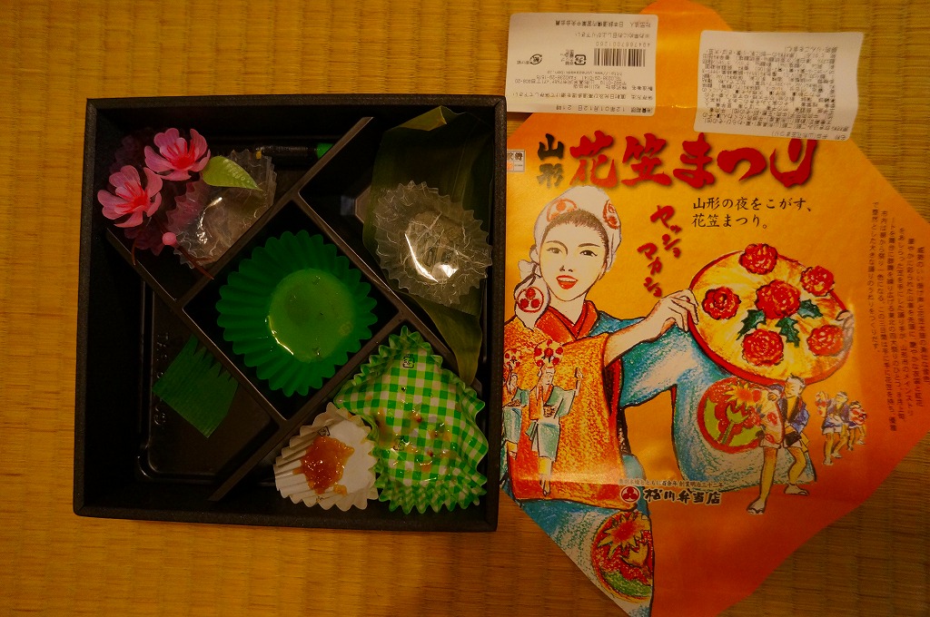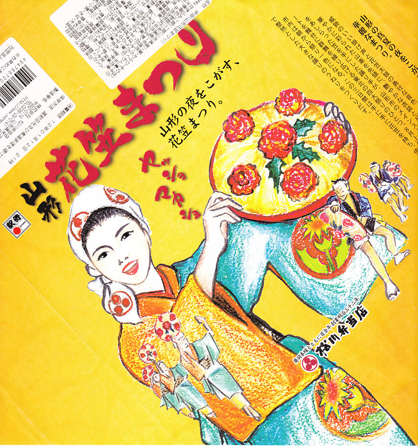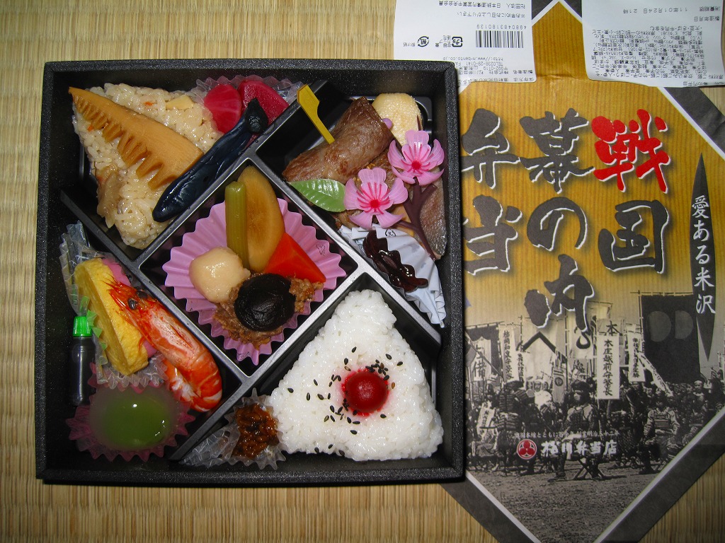 2012(平成24)年1月の京王百貨店の駅弁大会で輸送販売されたお弁当。既存の米沢駅弁「戦国幕の内弁当」とまったく同じ容器を、山形の花笠まつりを描いた掛紙で包む。中身は牛肉太巻、栗山菜おこわにぎり、牛肉団子、牛焼肉、根菜などの煮物、かまぼこ、玉子焼など。駅弁の名前から、てっきり山形駅の駅弁だと思った。駅弁の名前や掛紙からは思い付かぬ力強い内容と風味だった。価格は発売時で1,100円、2015年時点で1,200円。2015年頃までの販売か。