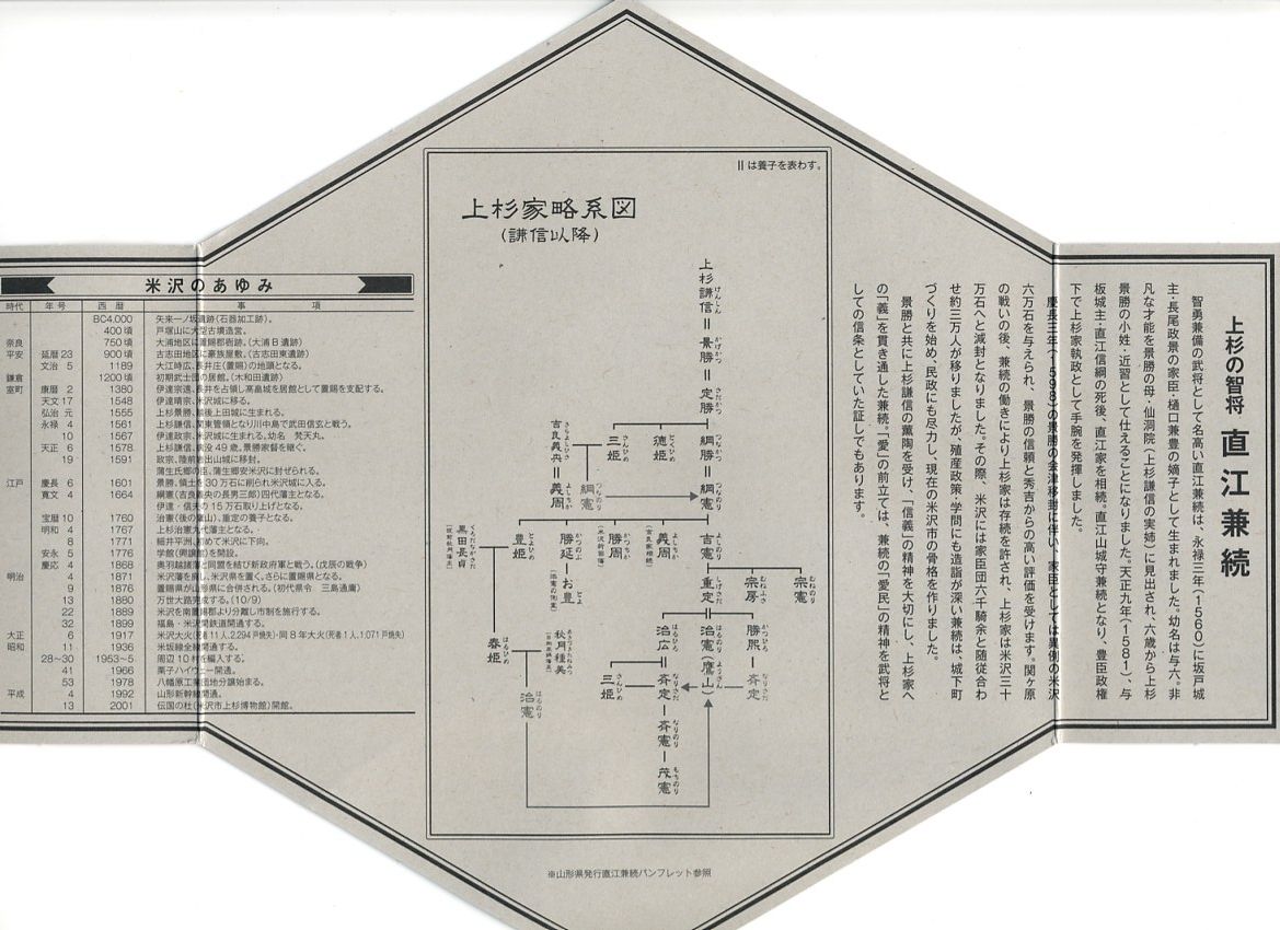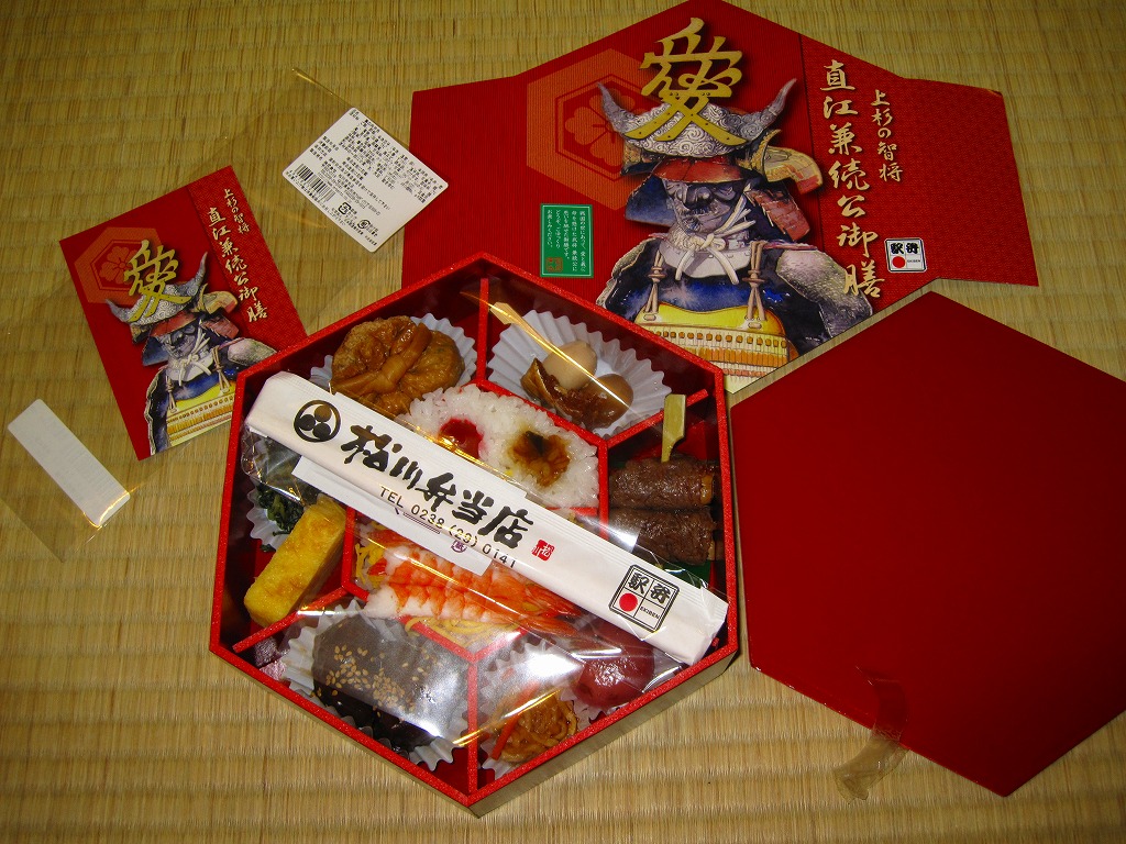 2009(平成21)年のNHK大河ドラマ「天地人」にちなんで、同年の3月1日に発売。正六角形で黒塗りの容器におしながきを置き、表面に直江兼続を、裏面に解説文と家系図を印刷したボール紙でふたをして、ラップの帯で留める。中身は中央に日の丸御飯と蒸し海老のちらし寿司を配し、その周囲を棒だら煮に玉こんと里芋の串刺し、米沢牛串、梅しそ団子と松前漬、米沢牛肉団子、玉子焼とおみ漬、巾着煮で囲む。