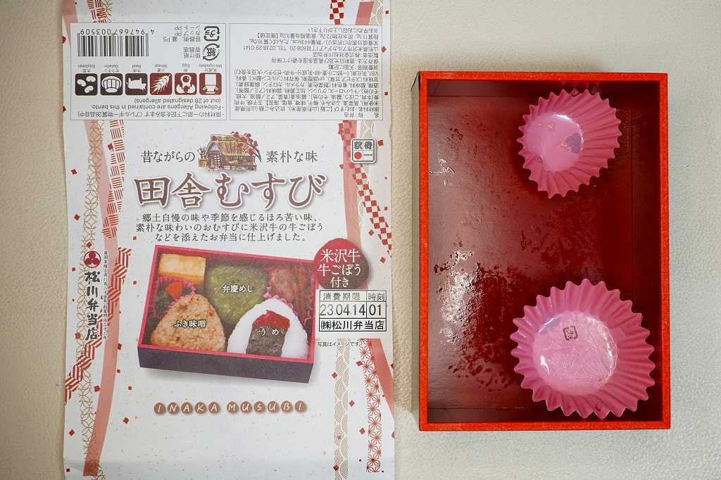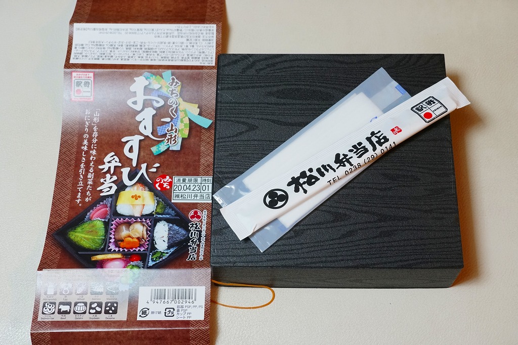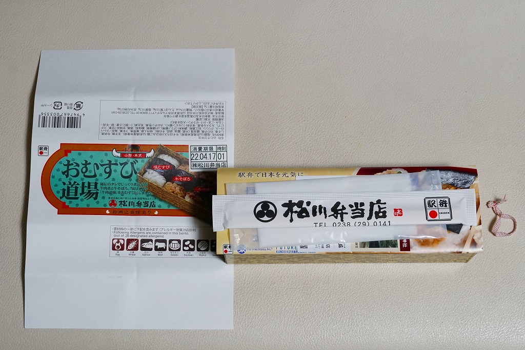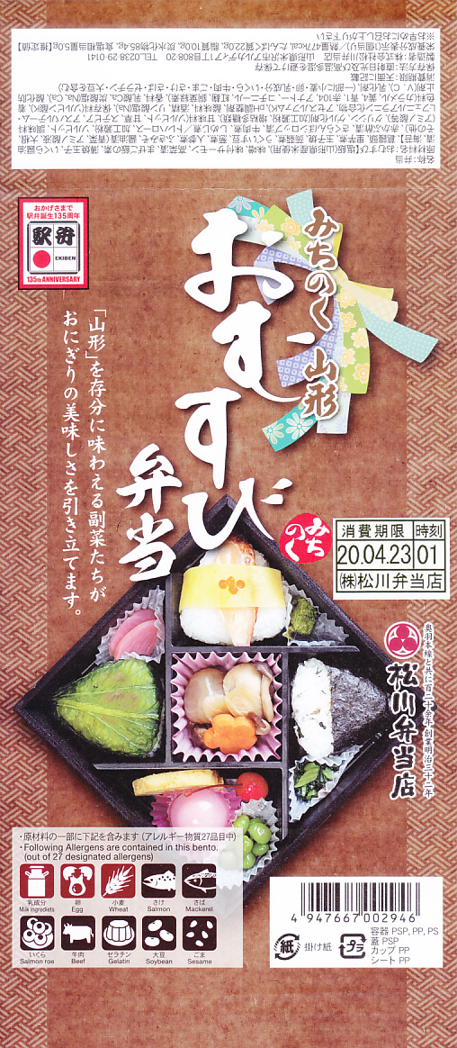 日本鉄道構内営業中央会が駅弁誕生135周年を記念して、会員のうち21社が2020(令和2)年4月10日から販売した、駅弁の原点であるおにぎりをメインとした記念弁当「駅弁誕生135周年おにぎり弁当」の、米沢駅弁の松川弁当店バージョン。