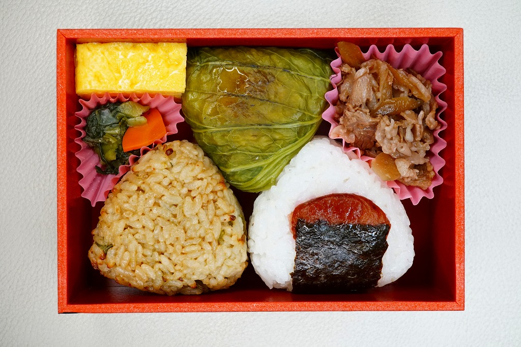 中身と商品名を描く掛紙の絵柄は、発売30年の米沢駅弁「牛肉道場」に似る。中身は俵飯に海苔を締めた牛そぼろおむすび、牛肉煮おむすび、塩おむすびが各1個と、玉子焼き、しそ巻、煮物、漬物であり、「牛肉道場」に少し似る。味も同じだと思うが、牛肉の分量が何倍も違うから、印象は異なる。