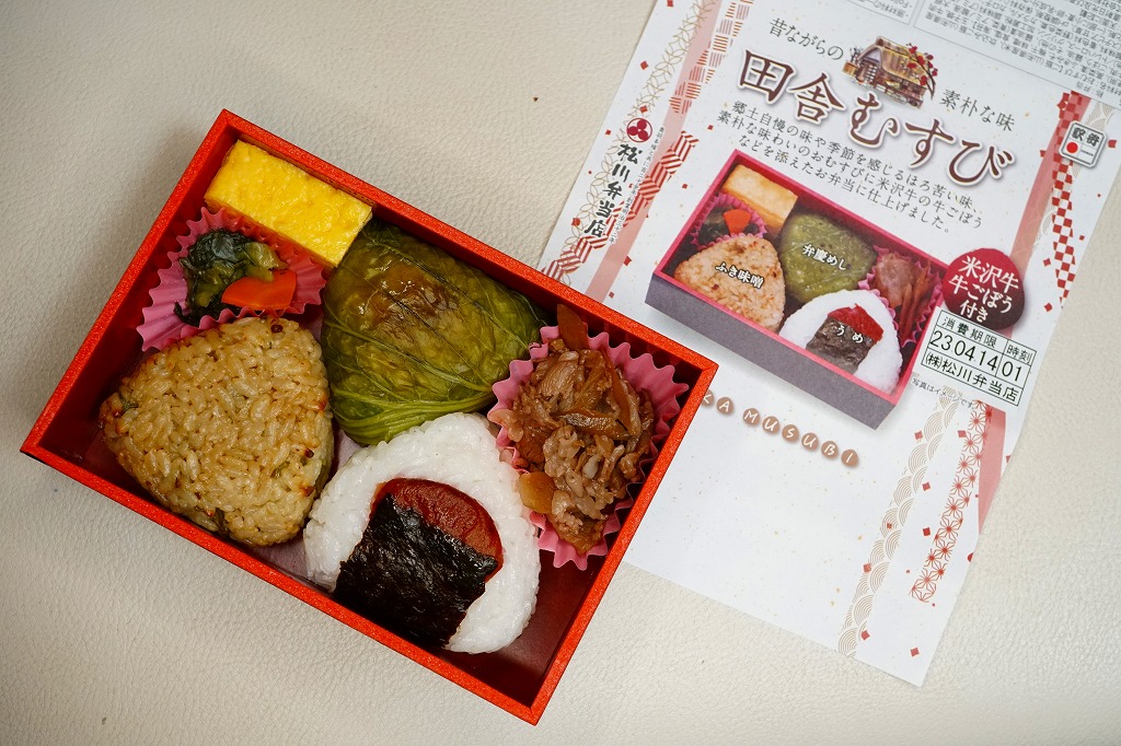 小さな長方形の容器に、ふき味噌、うめ、弁慶めしで各1個の三角おにぎりと、玉子焼、牛肉煮、漬物。千円+消費税の高価格は、1週間限りの記念商品であり、仙台駅や東京駅で千数百円の駅弁群に囲まれれば目立たない。解説なく詰めた「弁慶めし」とは。山形県内で米沢のある置賜(おきたま)地域でなく日本海側の庄内地域の郷土料理だそうで、握り飯に味噌を塗り青菜漬で巻いて焼いたもの。和歌山のめはりずしのような感じ。