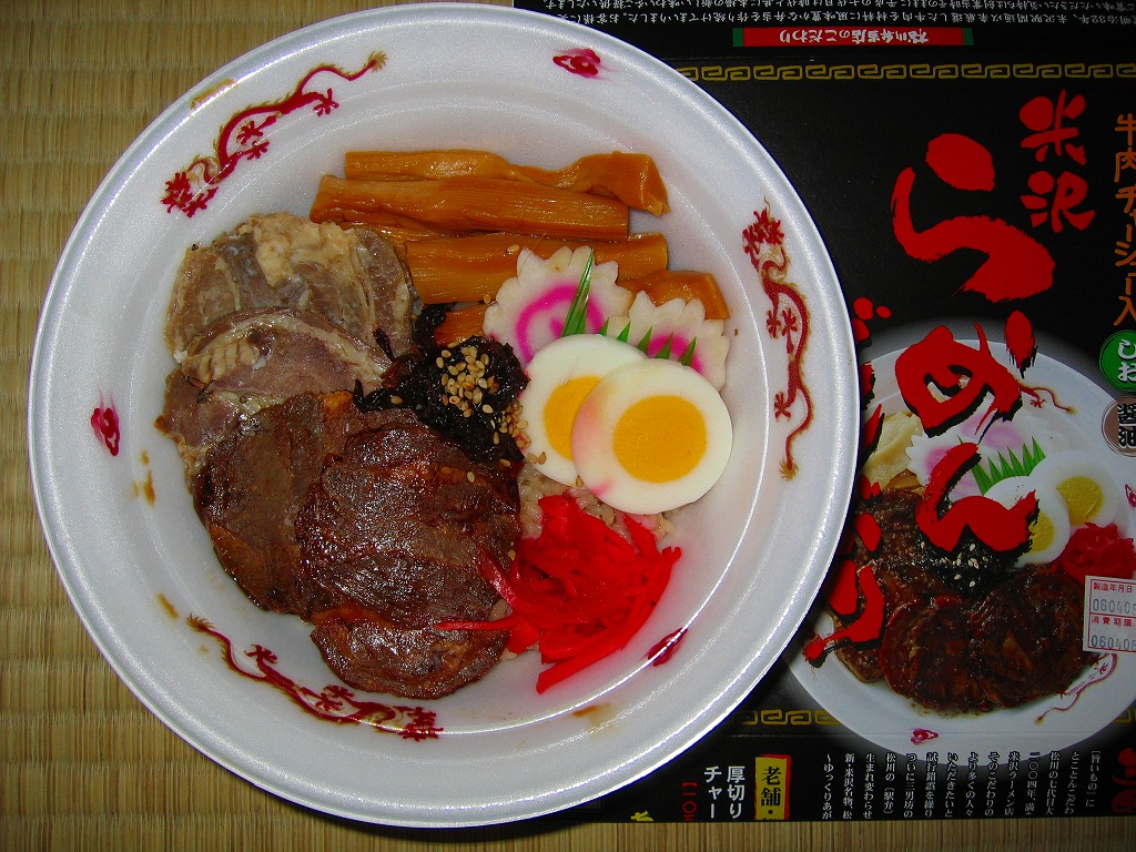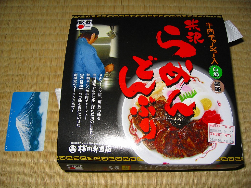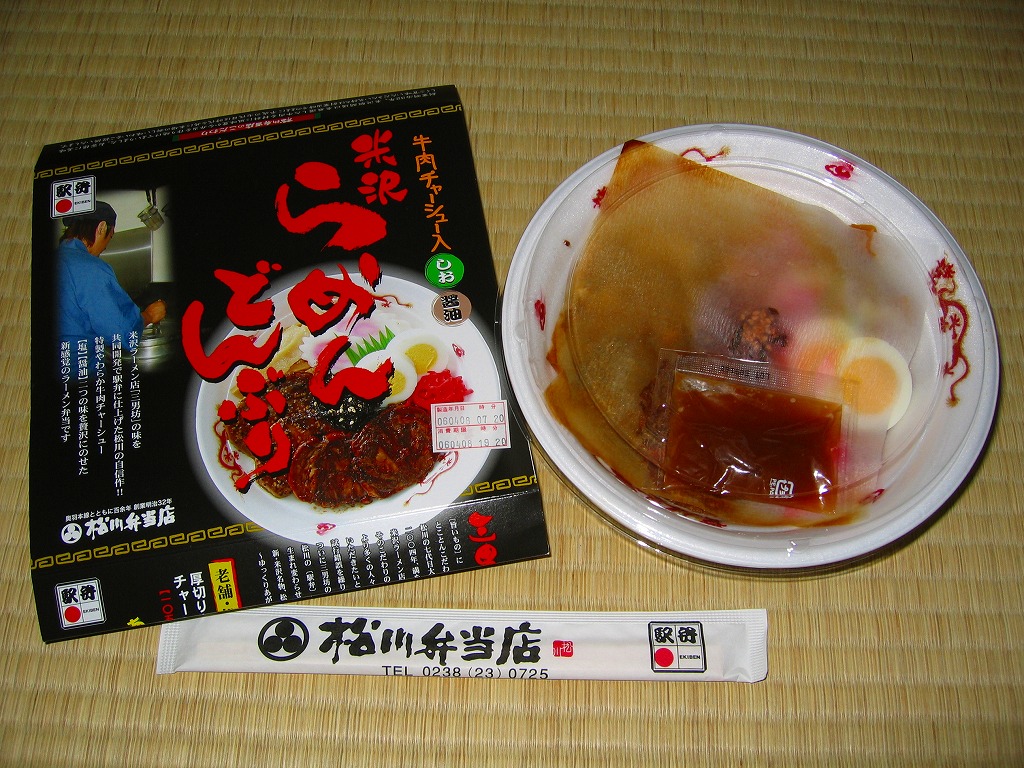 秋冬の駅弁大会シーズンに向けた、2005(平成17)年秋の新商品か。ラーメンのどんぶりを模した容器に透明なふたをかけ、中身写真や商品名などを載せたボール紙の枠にはめる。中身は御飯の上に牛チャーシューが2種2枚ずつと、メンマ、ナルト、シナチク、煮玉子、紅生姜など。米沢のラーメン店の味を共同開発で取り入れたそうな。