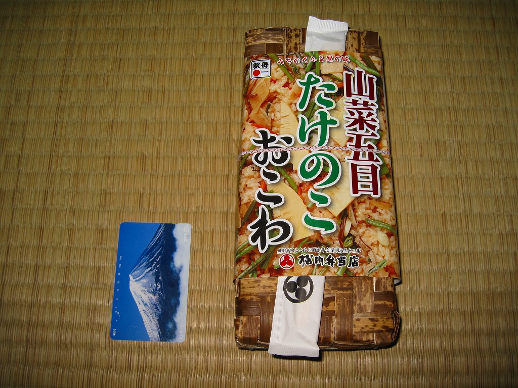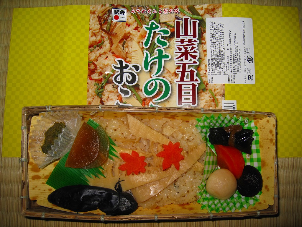 秋冬の駅弁大会シーズンに向けた、2009(平成21)年秋の新商品か。竹皮編みの柔らかく細長い長方形の容器を、中身を示すイメージ写真を商品名とともに印刷した掛紙を巻く。中身は写真と違い山菜がほとんど見えない五目おこわの上にタケノコ煮を載せ、ナス漬、ニンジンやサトイモなどの煮物、ふきみそ、ダイコンの味噌漬を添えるもの。