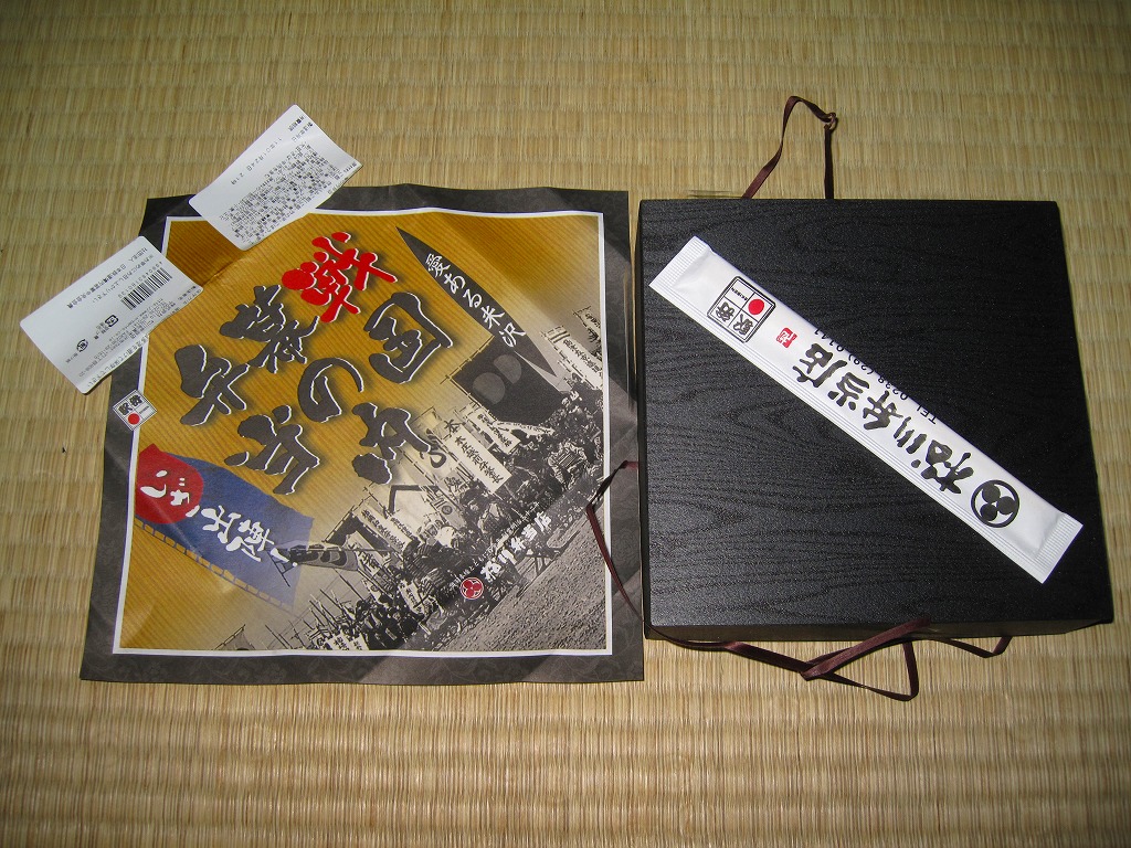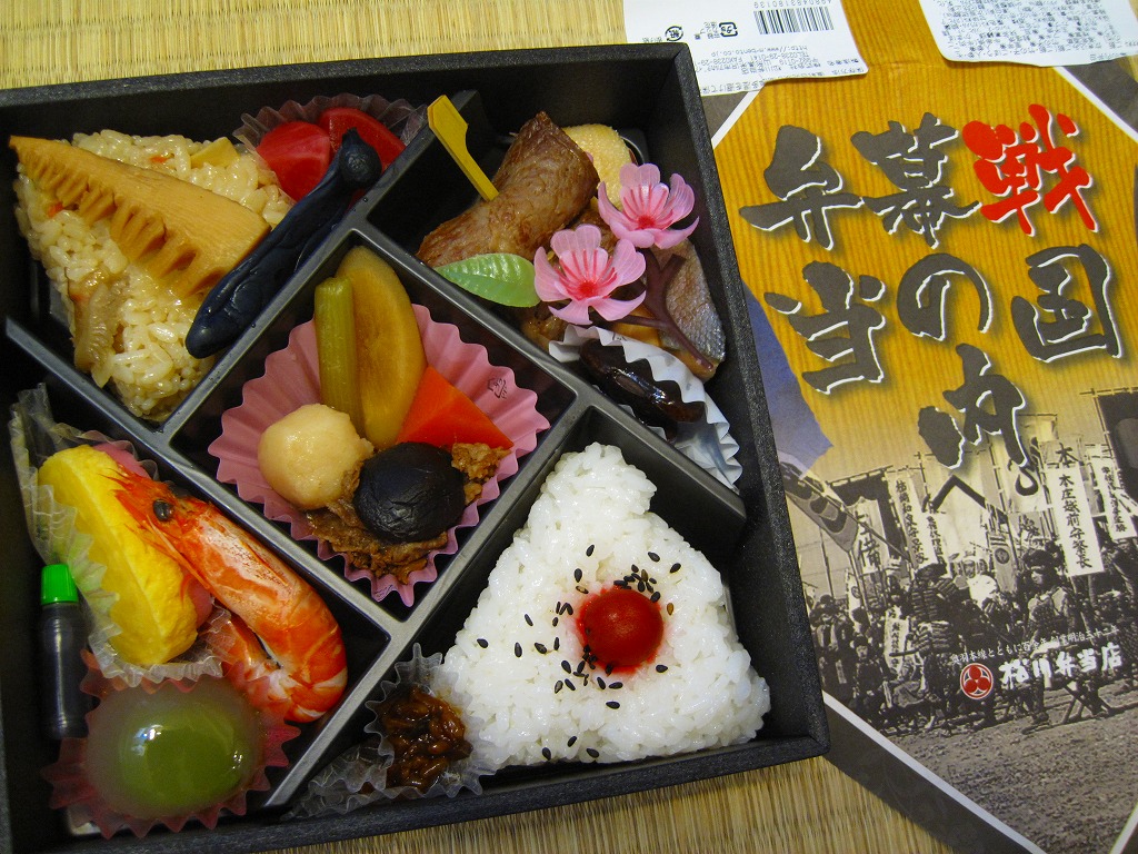 2010(平成22)年4月10,11日に東京駅構内で開催された「駅弁の日 東日本縦断駅弁大会(春)」こと第11回東日本縦断駅弁大会で発売か。黒い正方形の容器を、商品の名前と戦国イベントか何かの写真を印刷した正方形の掛紙で包む。