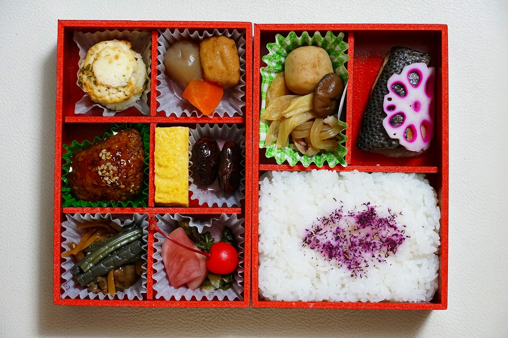 焼き鳥のイメージ写真が美しい掛紙に包まれた長方形の容器に、生姜飯を詰め、ゆず胡椒で味付けた焼き鳥を並べ、肉団子と柴漬けも載せ、ニンジンやタケノコなどの煮物と玉こんにゃくを添える。柑橘系プラスαの香りがする、視覚では感じ取れない所にある個性が印象的だった。