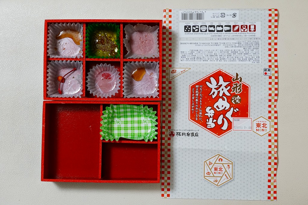 上記の駅弁「山形新幹線つばさ弁当(ニューデザイン)」の、2022年時点での姿。おそらくこの年の8月から、新幹線電車型のプラ容器を、透明プラ箱に入れるのでなく、ボール紙のスリーブに収める姿に替えた。価格はこの年に、1,380円から1,400円に値上げ。旧版の併売も続く。