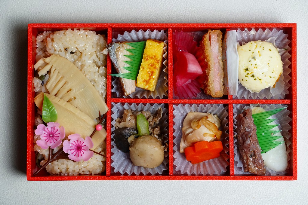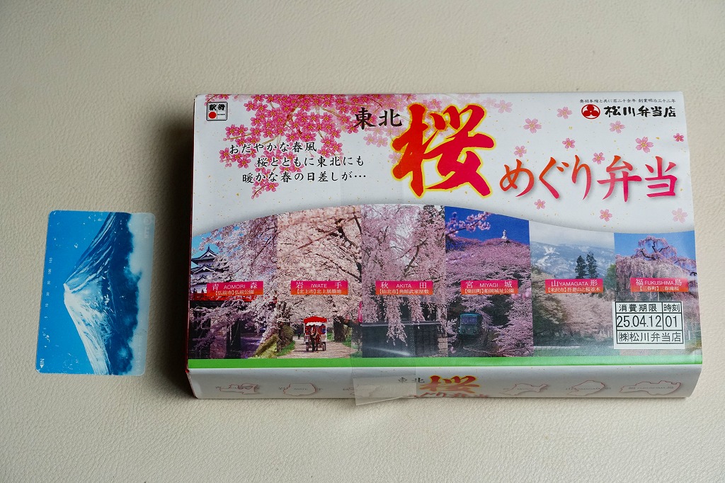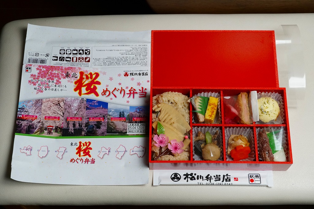 中身はその裏面によると、青森のポテトとホタテのマヨネーズ焼き、岩手の鮭焼きと玉子焼き、宮城の牛たんとミニ笹かまぼこ、秋田のミニハムカツと紅大根酢漬、山形の黒毛和牛のすき焼きと、御飯は山形の山形県産米山菜おこわたけのこ。桜や春というよりはむしろ、例えば「東北福興弁当」に負けないような、東北6県のコンセプトで多種のおかずを詰めるお弁当だった。