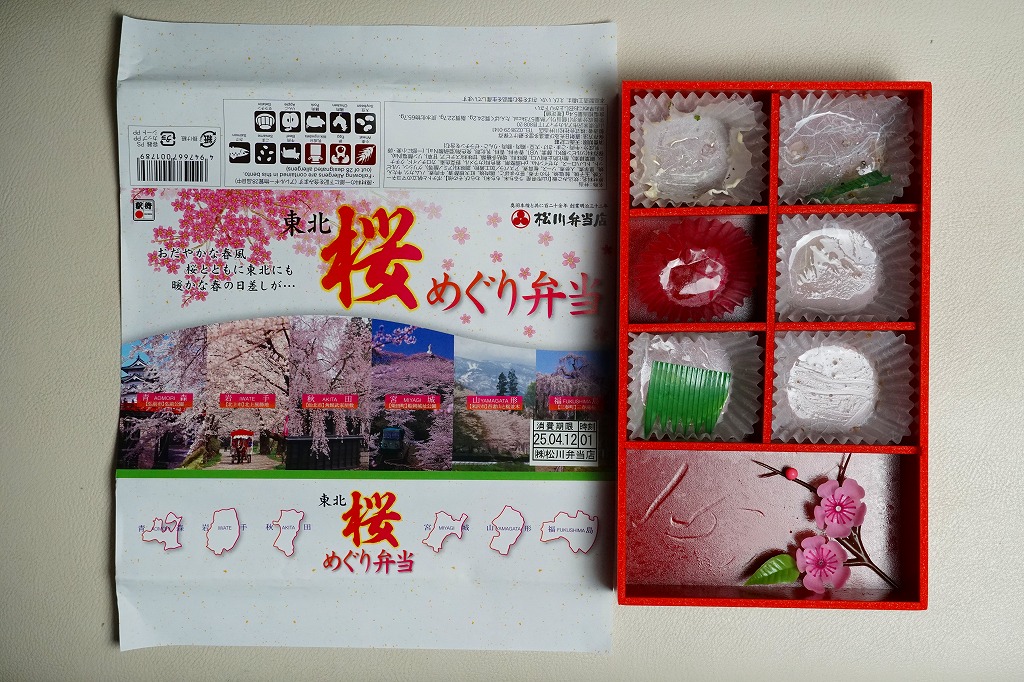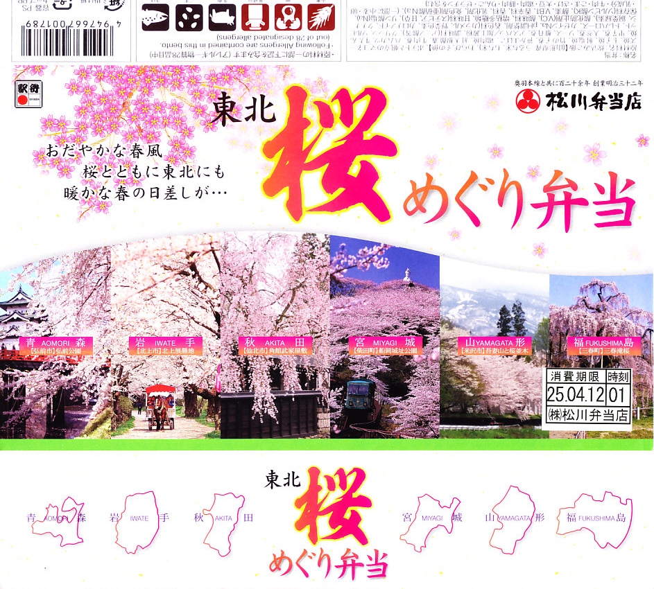 2015(平成27)年3月に各地で発売か。調製元の公式サイトでは、春季限定や予約限定の駅弁と紹介されてきたが、実態としては桜の時期のスーパーなどでの駅弁大会や東京駅などの遠隔地に出荷される、催事向け商品とみられる。やや大きな長方形の赤い容器を包む掛紙には、「桜」の文字を大きくした商品名に、桜花のイラストや東北六県の写真を載せ、裏面には写真付きのおしながきを記した。