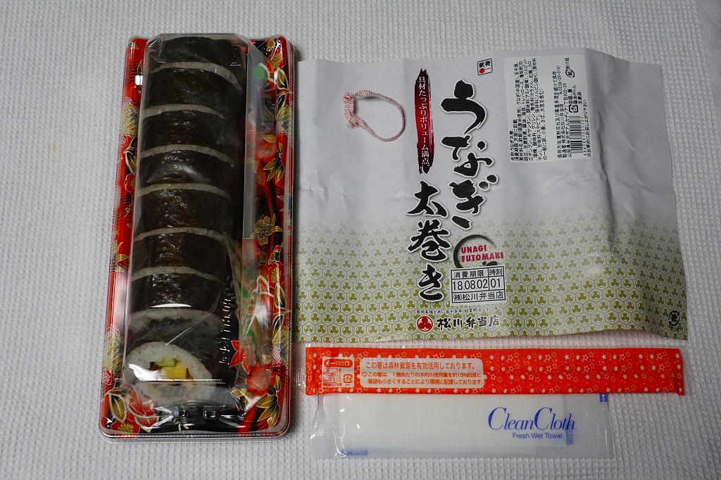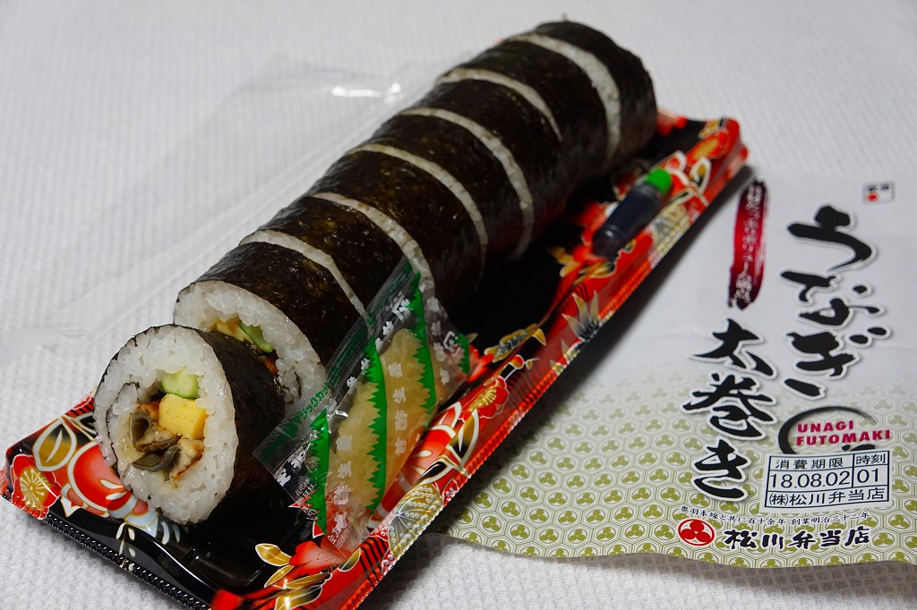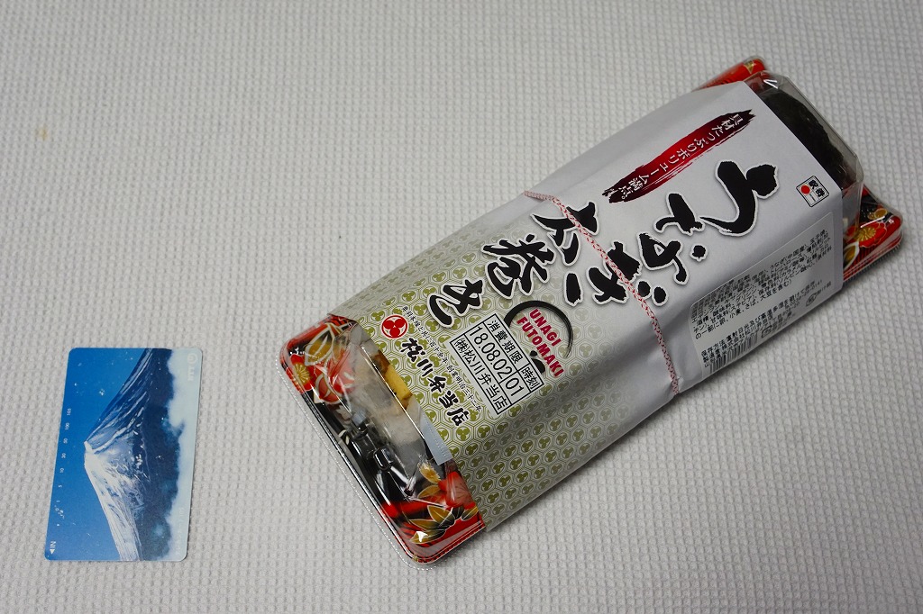 寿司惣菜向けプラ製トレーに、8切れにカットした細身の太巻きを横たえ、透明な上げ蓋をして、商品名を書いた掛紙で巻く。細身の太巻きの具のごく一部がウナギ。最近のウナギ弁当としては比較的廉価でも、味や香りもそれくらい細い感じ。