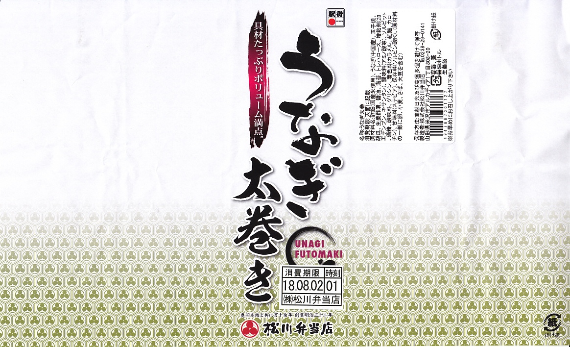 2018(平成30)年に2回あった土用の丑の日の2回目に、東京駅の駅弁売店「駅弁屋 祭」で実施された「土用丑の日 うなぎ駅弁大会」で買えた弁当。その1回目のこの売店は、この調製元のウナギ弁当で埋め尽くされていた。調製元が米沢駅の駅弁屋なのでここに収蔵するが、今の米沢駅にはたしてウナギの駅弁など存在するのだろうか。2014年や2017年にも売られた模様。
