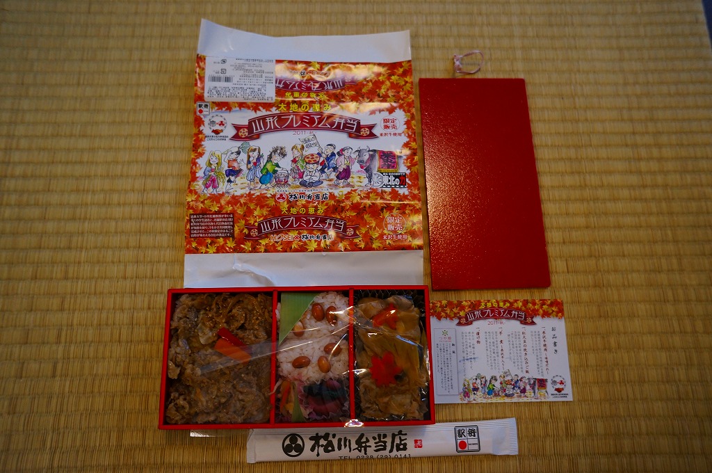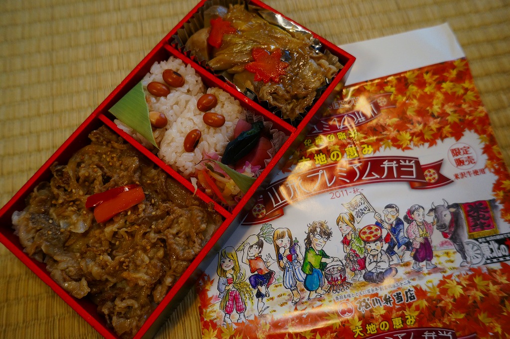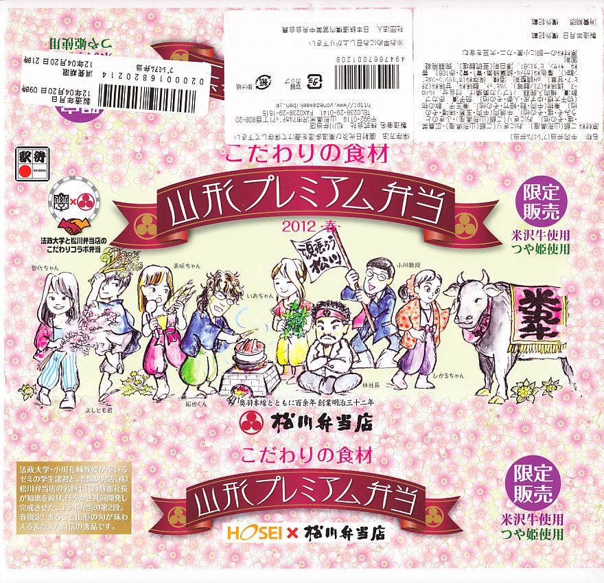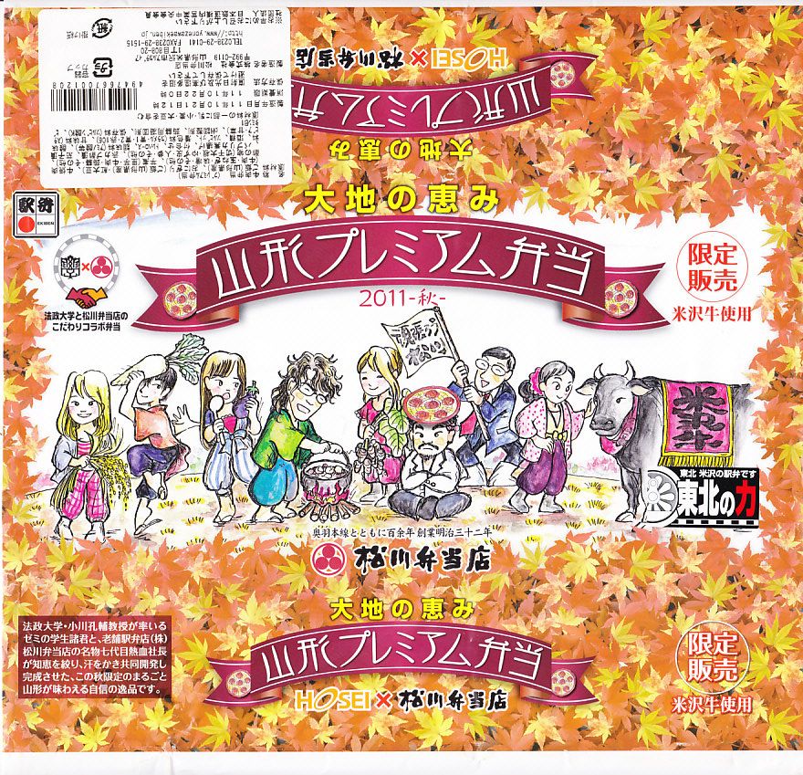 東京都千代田区の法政大学経営学部小川孔輔ゼミと調製元との共同開発により、2011(平成23)年10月15日から11月末まで、おそらく主に東京エリアで販売された期間限定駅弁。長方形の発泡材容器に、ゼミの先生と生徒を描いたという紅葉柄の掛紙を巻く。中身は山形米「つや姫」の白御飯に米沢牛カルビ焼肉を載せた牛丼と、赤豆の俵飯に赤カブや長ナスなどの漬物と、米沢牛入りの芋煮。