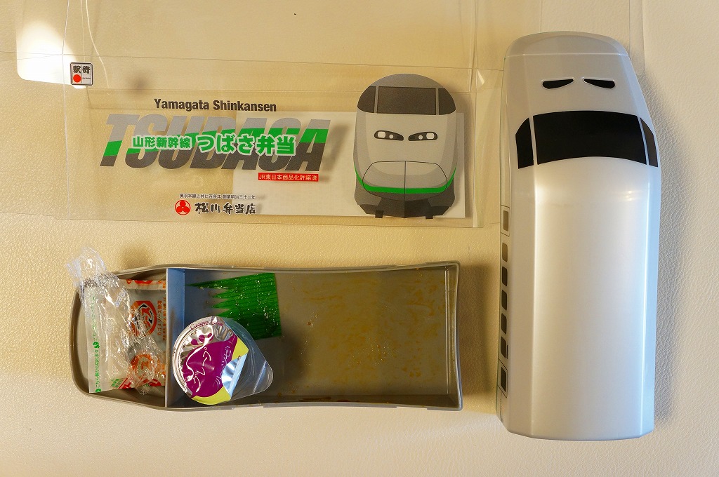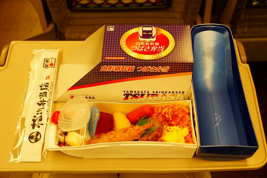 2014(平成26)年の夏までに、下記の駅弁「山形新幹線つばさ弁当」をリニューアル。中身や価格を変えず、実物の車両の塗り替えを反映し、容器の色を変えた。山形新幹線E3系電車の先頭車両を模したプラスティック製の容器にチキンライスを詰め、ハンバーグ、エビフライ、ウインナー、フライドポテト、スクランブルエッグ、鶏唐揚、チーズ、ぶどうゼリーなどを詰める。