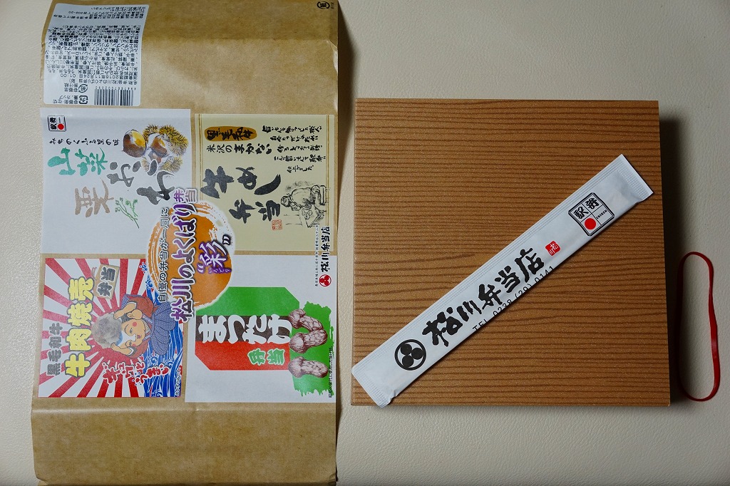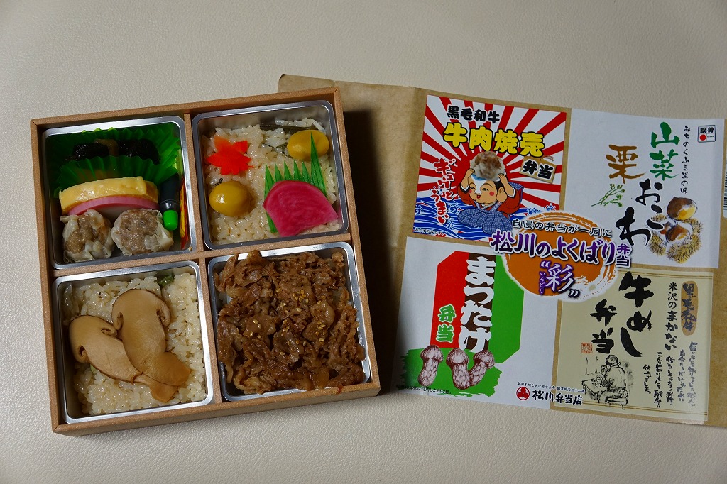 2016(平成28)年の11月から翌年2月までの販売か。当時に各地の駅弁屋の名前で登場していた、既存の4駅弁の組合せ商品の、米沢駅の松川弁当店バージョン。ここでは「華」と「彩」の2種類が出た。この「彩」は同社の駅弁「黒毛和牛牛肉焼売弁当」「山菜栗おこわ」「米沢のまかない牛めし弁当」「まつたけ弁当」の詰合せで、実物を思い当たらないまつたけ弁当を除き、それぞれの駅弁の中身の特徴が取り入れられた。「黒毛和牛牛肉焼売弁当」以外はすべて飯を詰めているので、分量は多めに感じる。2021年時点で季節限定かつ要予約の商品として、公式サイトに掲載されていたが、2022年には消えていた。