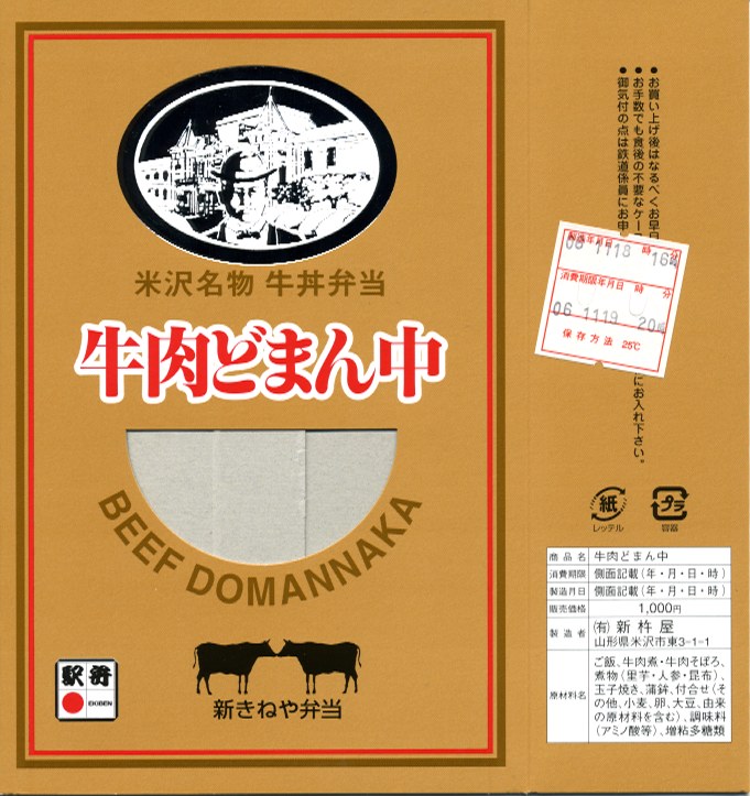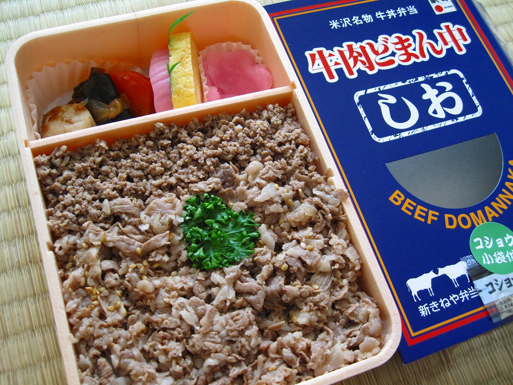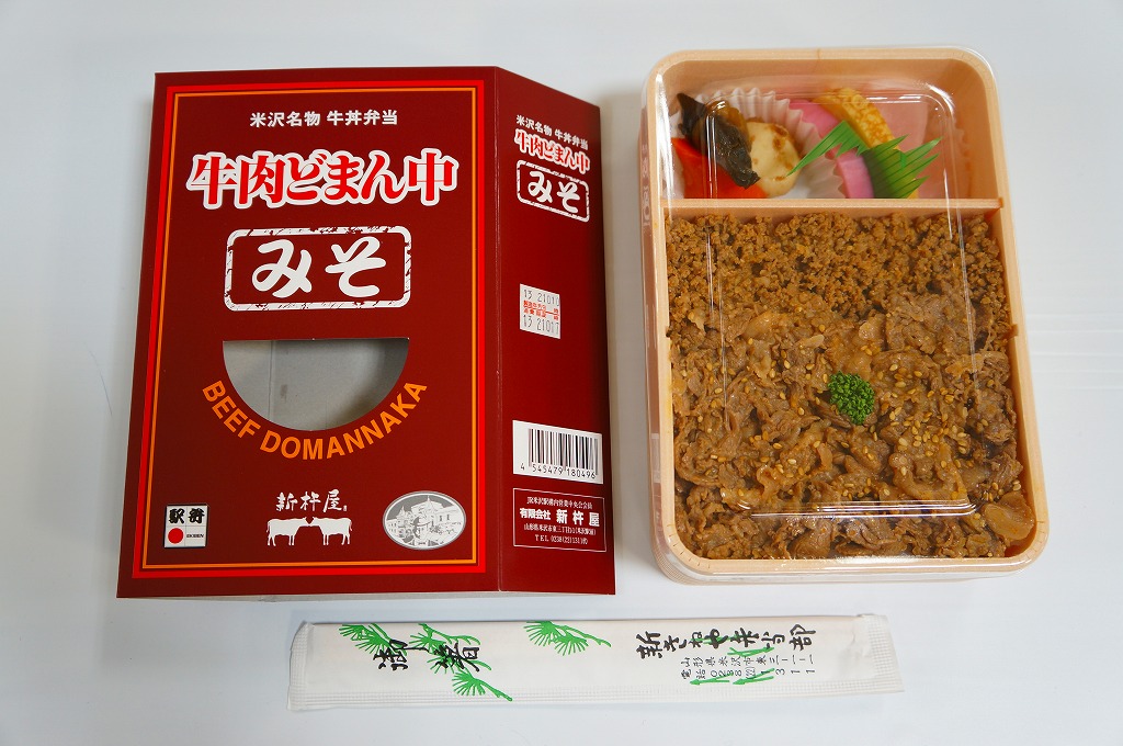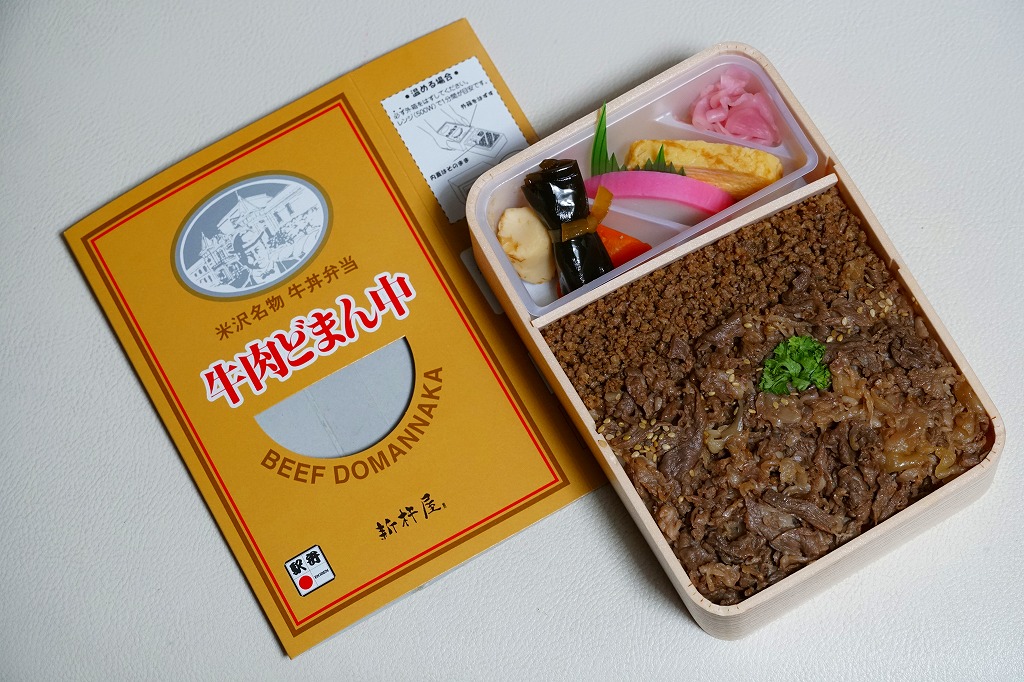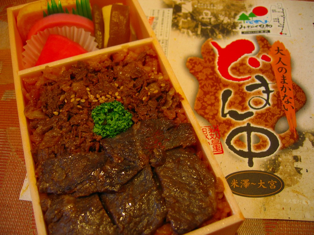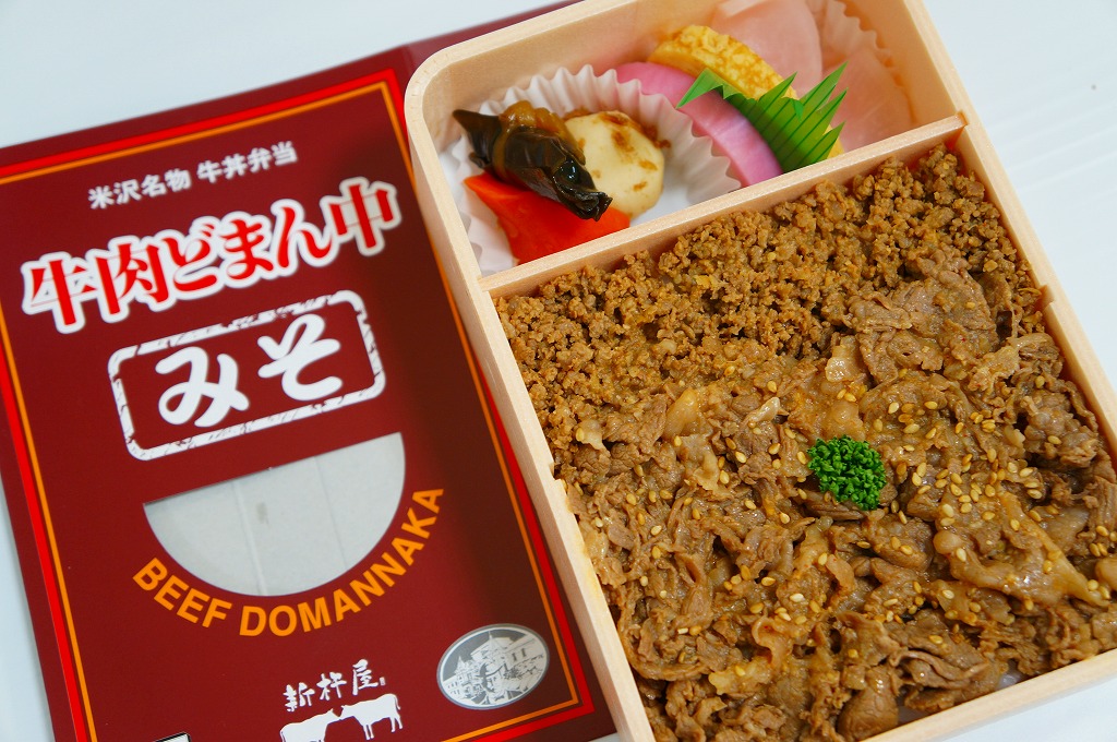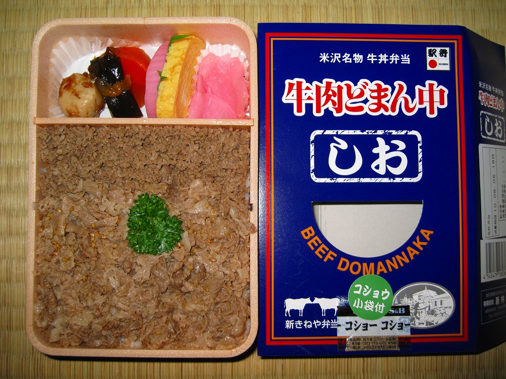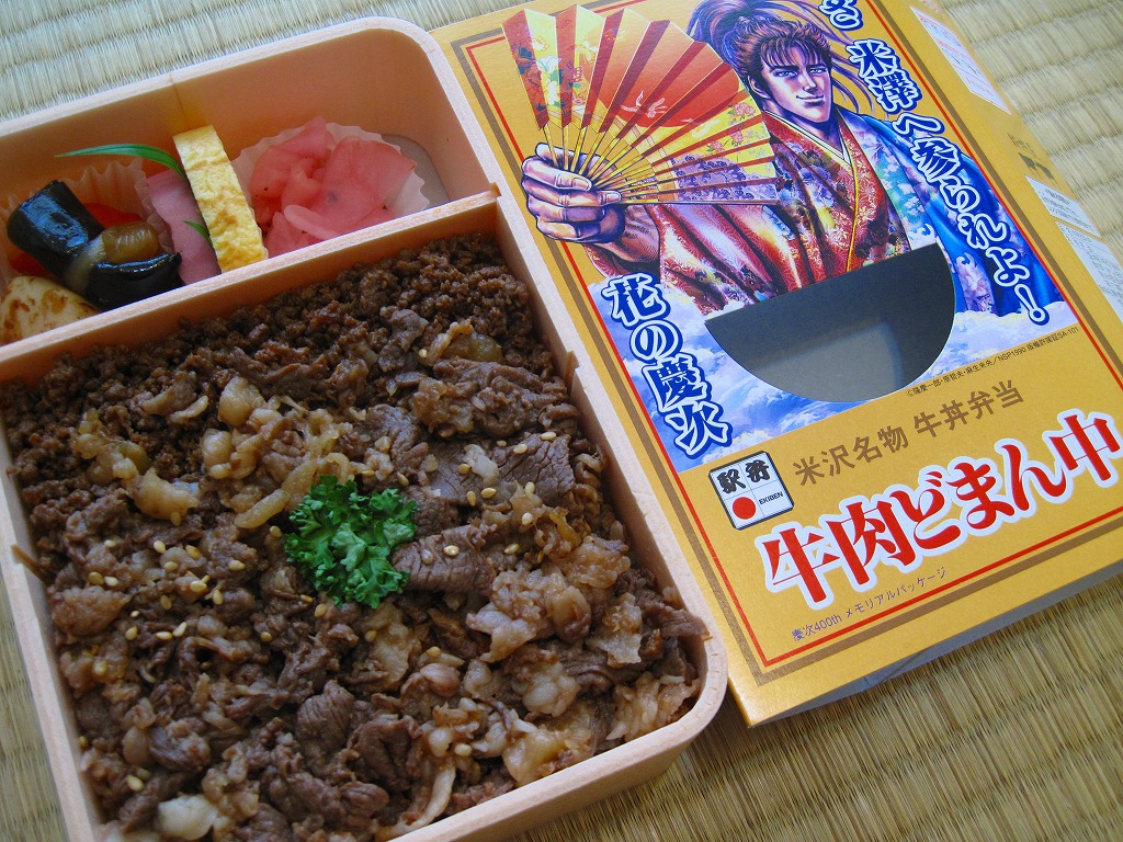 1993(平成5)年の発売。山形新幹線開業記念駅弁と紹介する資料が多いが、1992(平成4)年7月の開業とは1年のずれがある。米沢と日本を代表する、有名で名物の駅弁。1992年に公募で名前が付けられた山形生まれのお米「どまんなか」の白御飯を、米沢の名物である牛肉にちなみ、甘辛な牛肉煮と牛そぼろで覆い、サトイモ、ニンジン、ニシン昆布巻、かまぼこ、玉子焼、大根桜漬を添える。米沢の名物と山形の米を、デザインでも内容でもシンプルに組み合わせた。