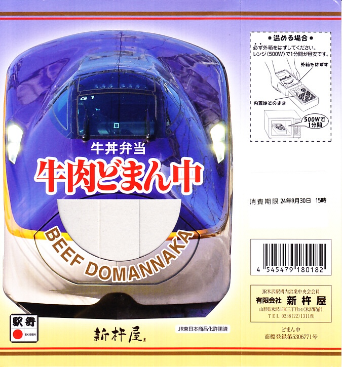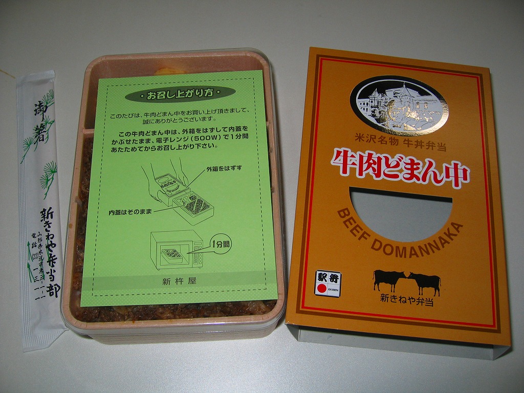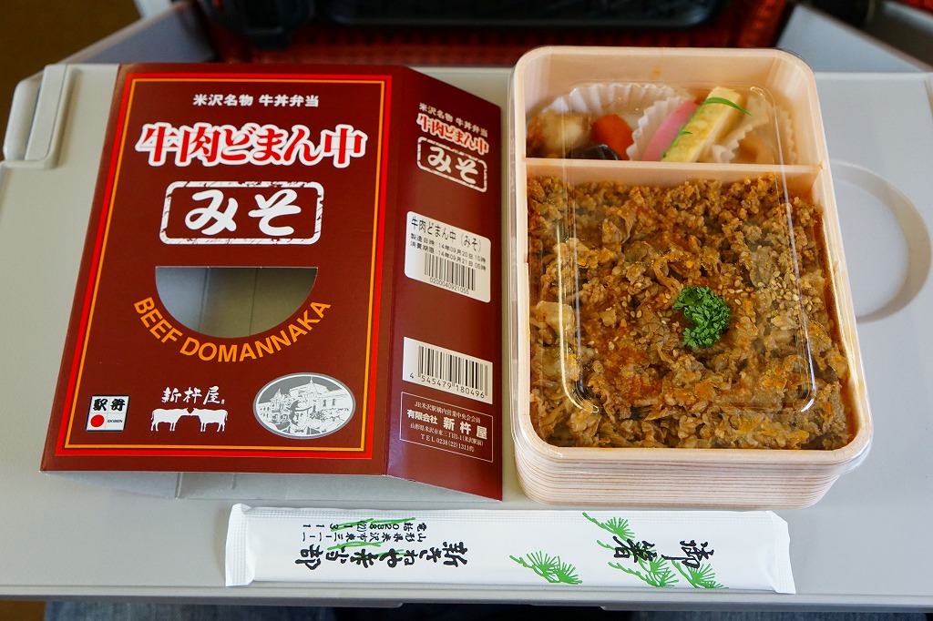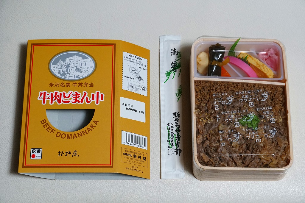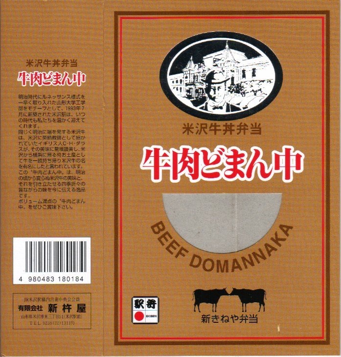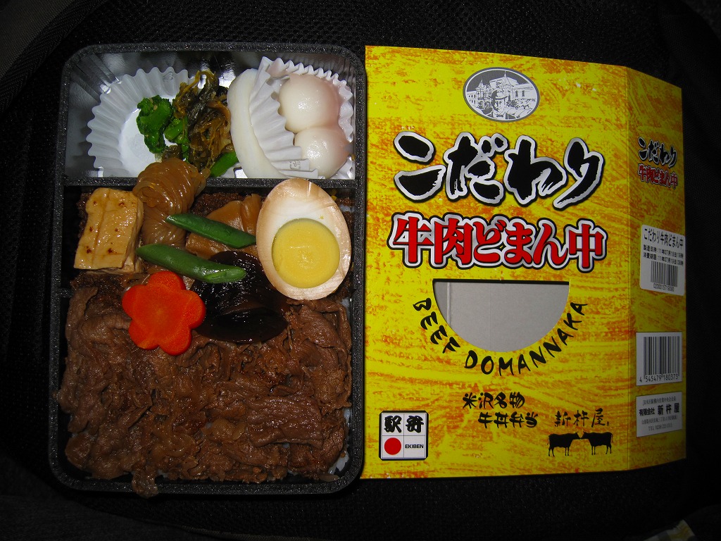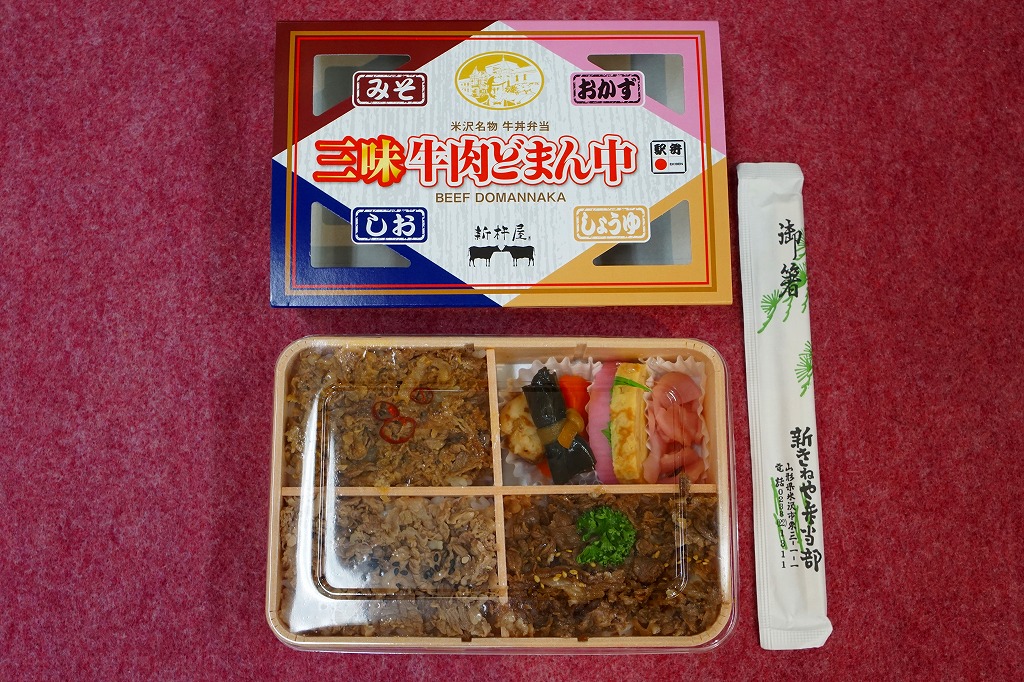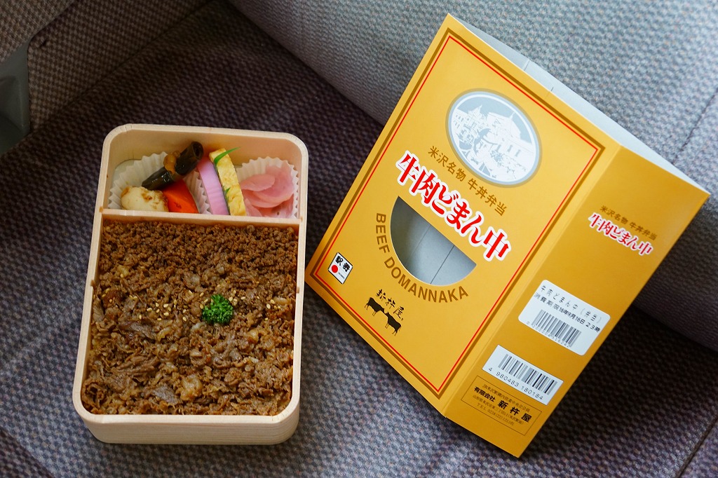 1993(平成5)年の発売。山形新幹線開業記念駅弁と紹介する資料が多いが、1992(平成4)年7月の開業とは1年のずれがある。米沢と日本を代表する、有名で名物の駅弁。1992年に公募で名前が付けられた山形生まれのお米「どまんなか」の白御飯を、米沢の名物である牛肉にちなみ、甘辛な牛肉煮と牛そぼろで覆い、サトイモ、ニンジン、ニシン昆布巻、かまぼこ、玉子焼、大根桜漬を添える。米沢の名物と山形の米を、デザインでも内容でもシンプルに組み合わせた。