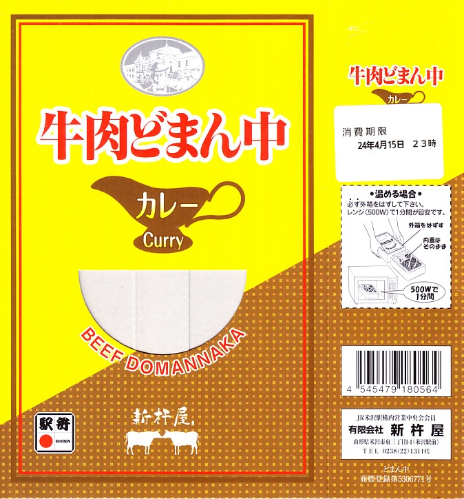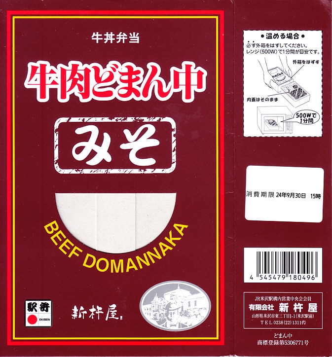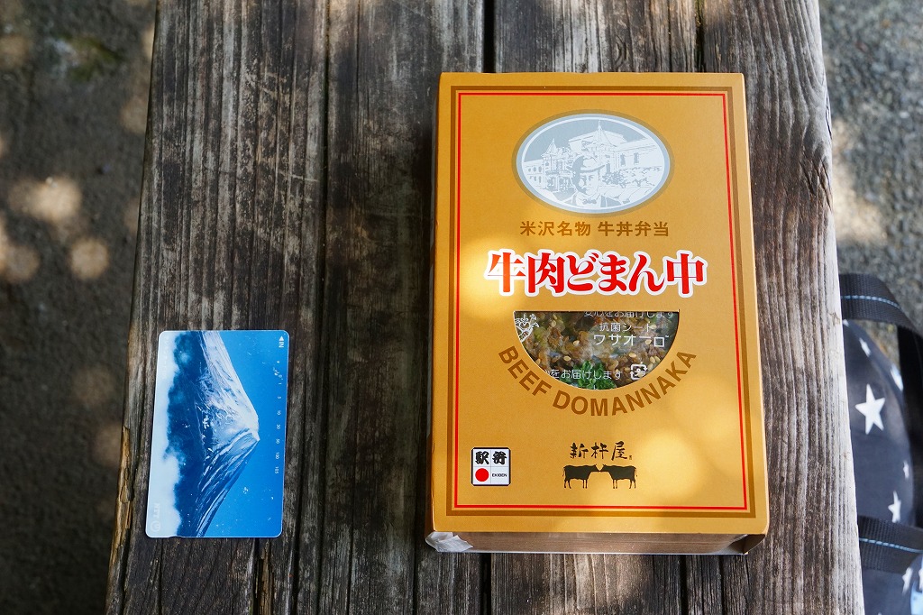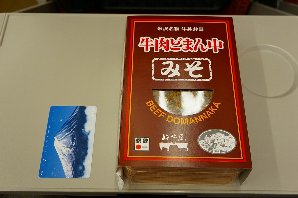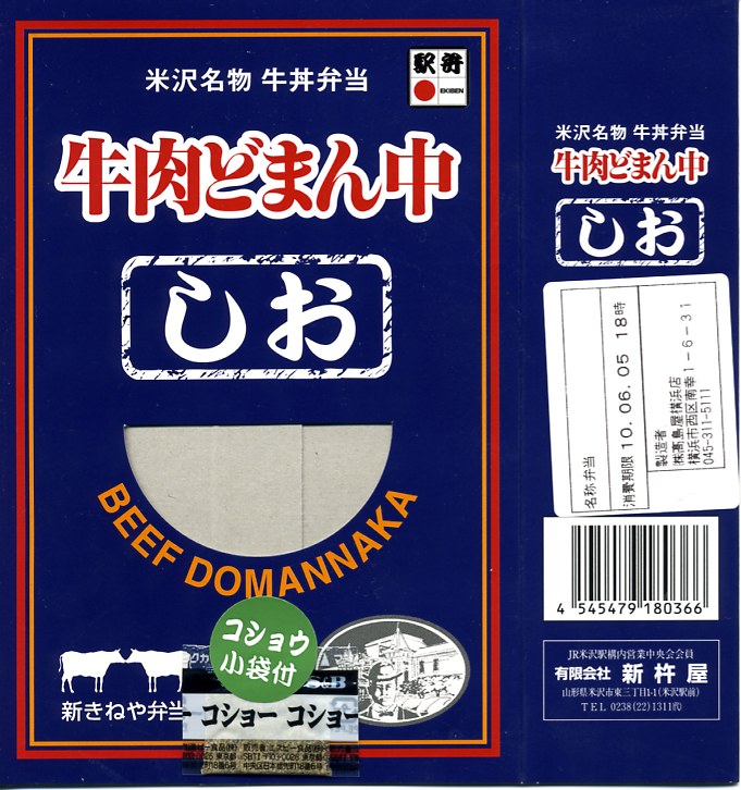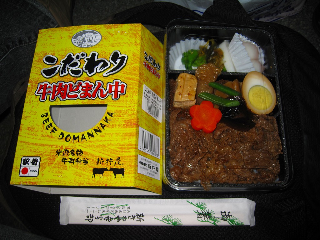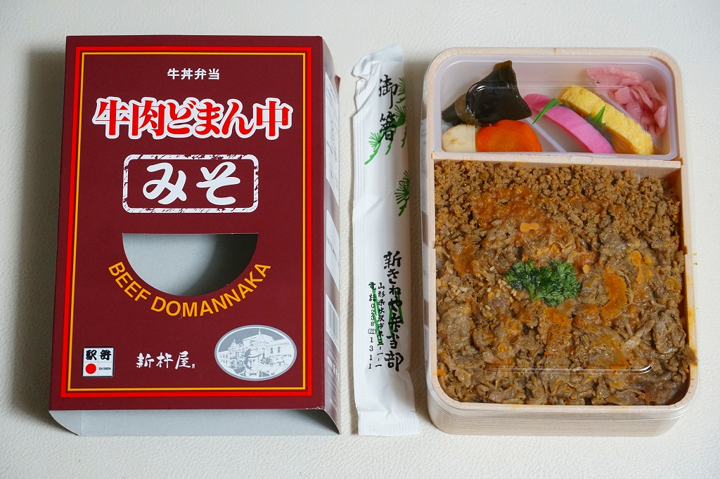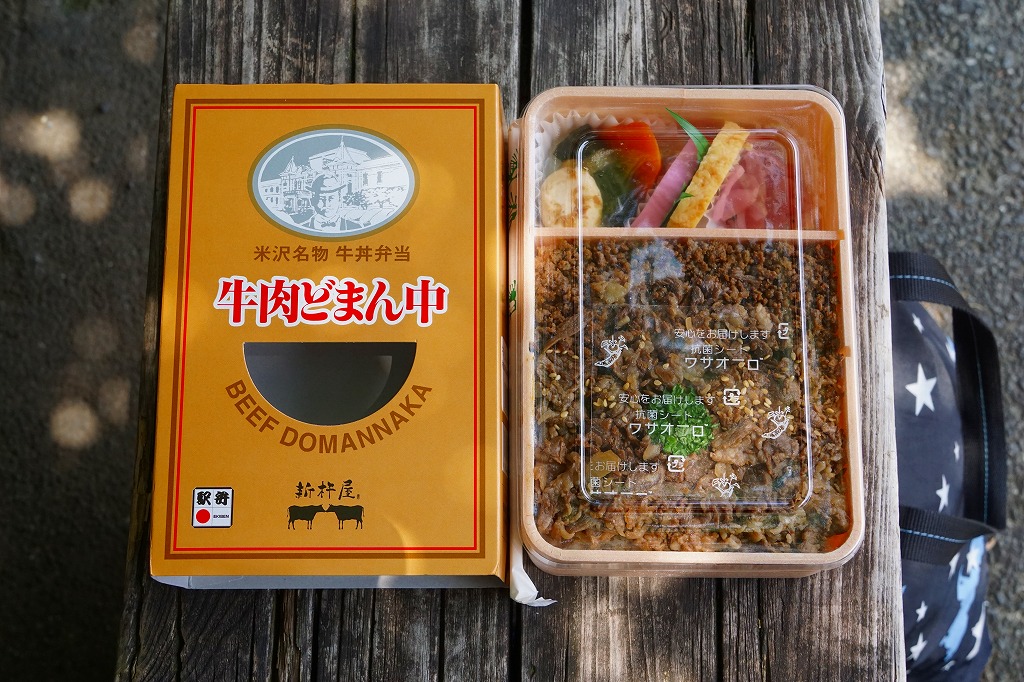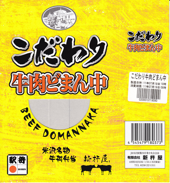1993(平成5)年の発売。山形新幹線開業記念駅弁と紹介する資料が多いが、1992(平成4)年7月の開業とは1年のずれがある。米沢と日本を代表する、有名で名物の駅弁。1992年に公募で名前が付けられた山形生まれのお米「どまんなか」の白御飯を、米沢の名物である牛肉にちなみ、甘辛な牛肉煮と牛そぼろで覆い、サトイモ、ニンジン、ニシン昆布巻、かまぼこ、玉子焼、大根桜漬を添える。米沢の名物と山形の米を、デザインでも内容でもシンプルに組み合わせた。