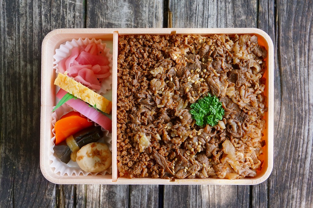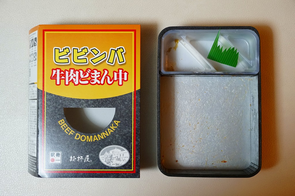 2020(令和2)年1月の京王百貨店の駅弁大会で実演販売。米沢と日本を代表する駅弁「牛肉どまん中」について、具をビビンバに替えたもの。白飯を牛肉煮と牛焼肉とナムルで覆い、付合せは普段と同じ煮物とかまぼこと玉子焼と漬物とし、コチジャンを別添する。甘みも辛さも固さもほどほどの、無難にうまい牛焼肉弁当だった。2021年で終売か。