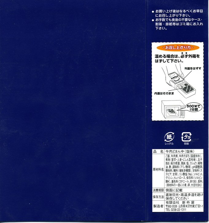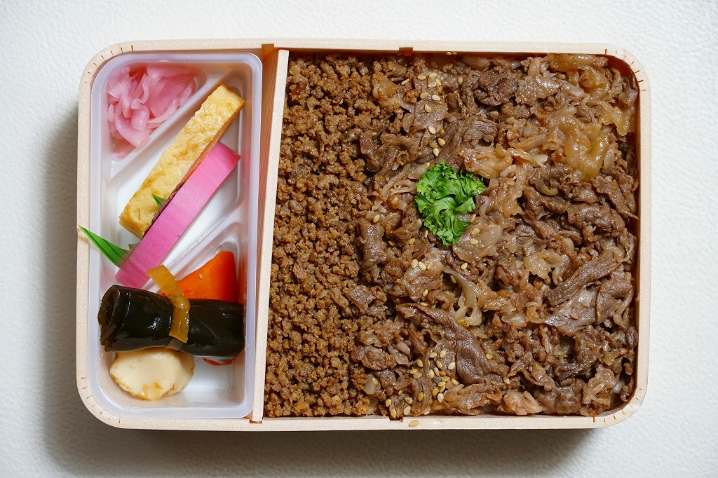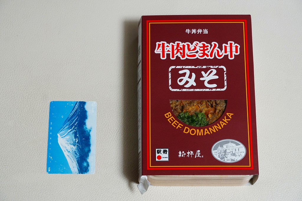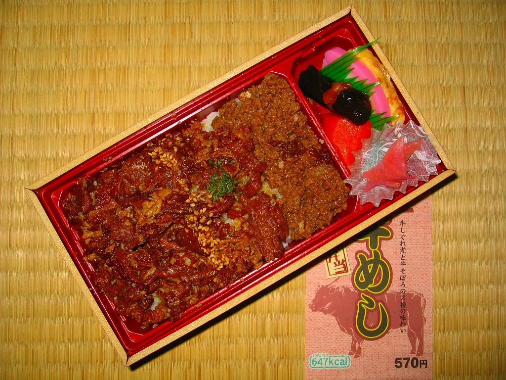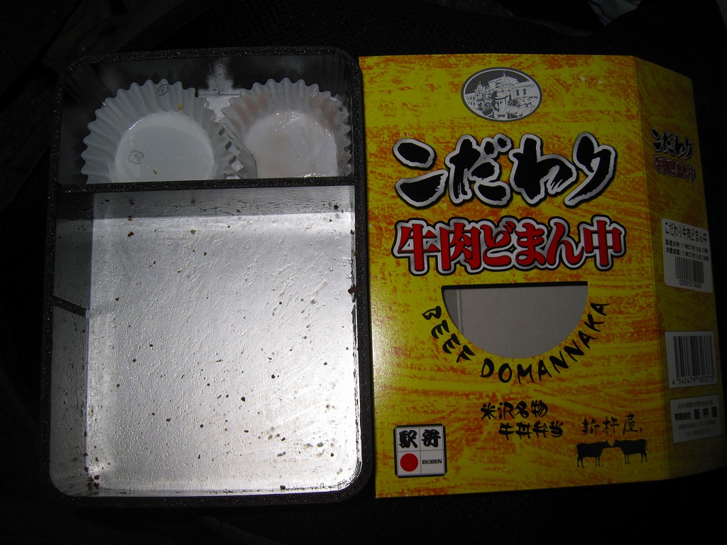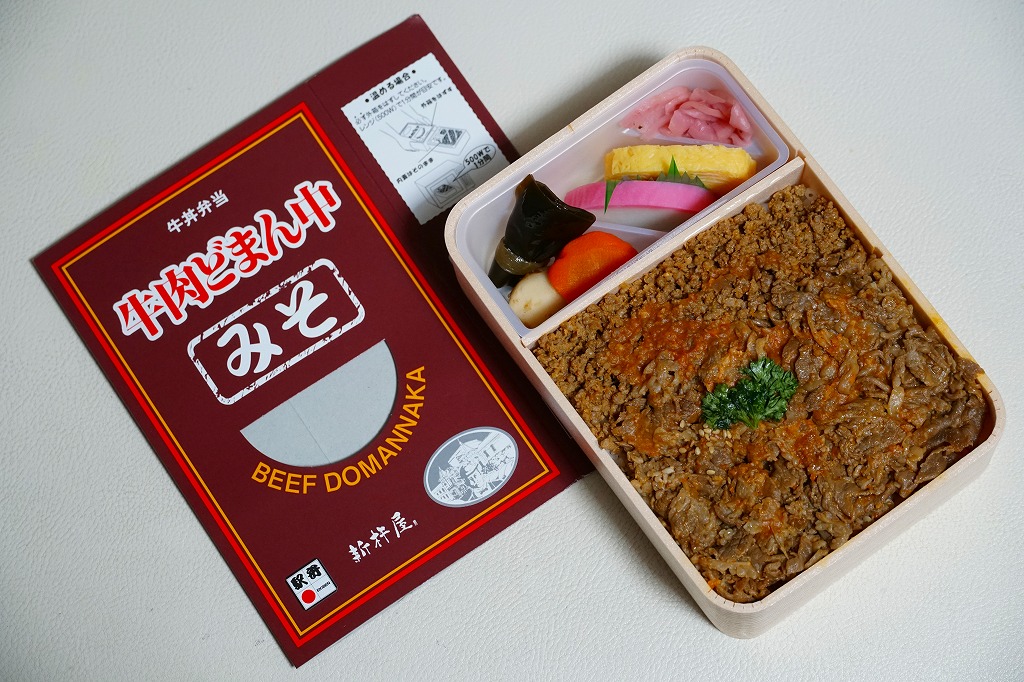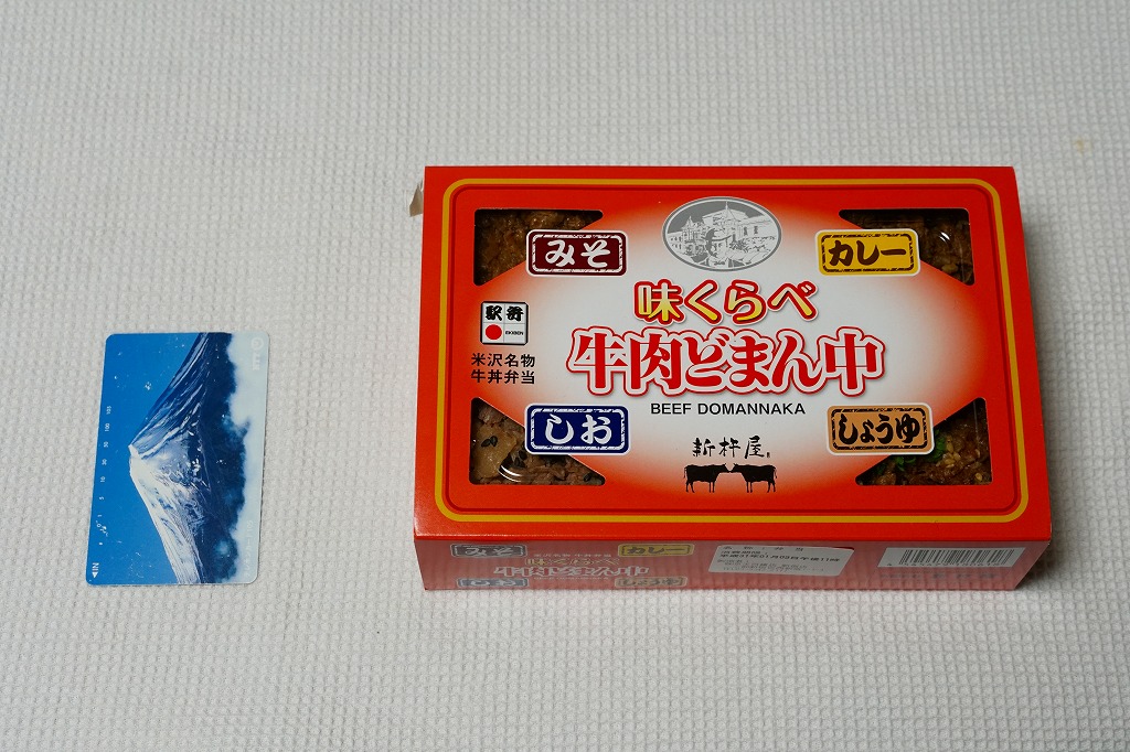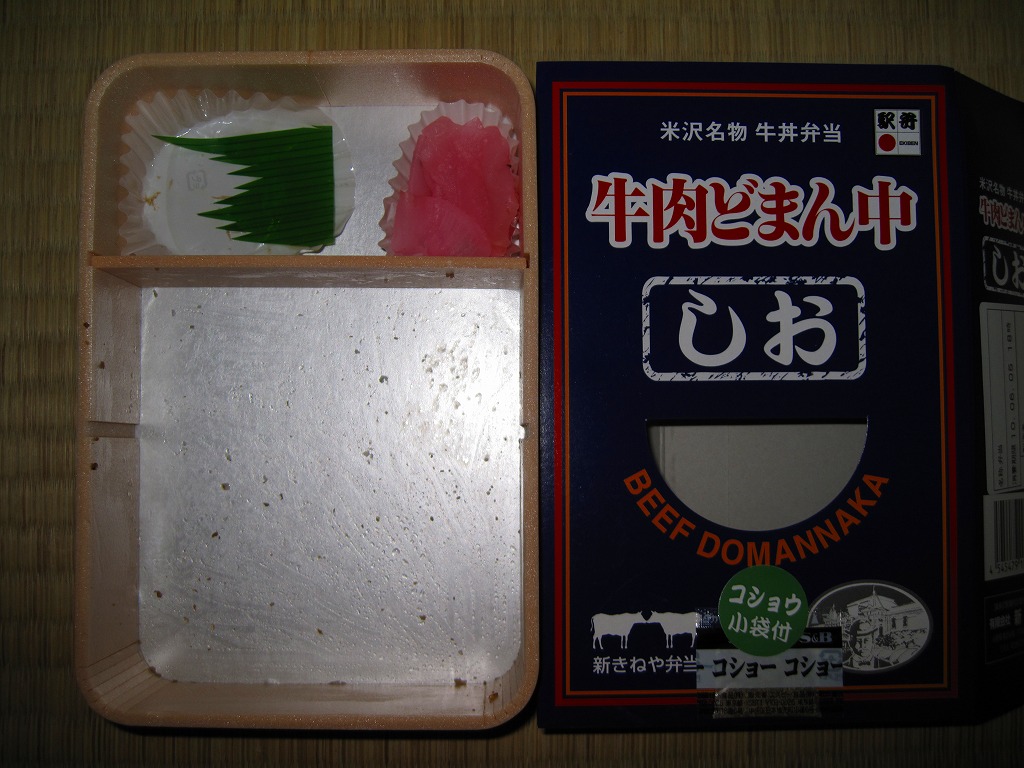 中身は牛肉の混ぜ御飯と上を半分ずつ、牛すき焼き肉と牛焼肉で埋め、玉子焼、かまぼこ、赤カブ酢漬などを添えるもの。名前のとおり、有名駅弁「牛肉どまん中」の姉妹品だろう。容器と肉と飯に差異があるので、雰囲気はそこそこ異なる。分量を抑えて千円を切った価格にも好印象。後に米沢駅でも売られたらしい。2010年頃までの販売か。