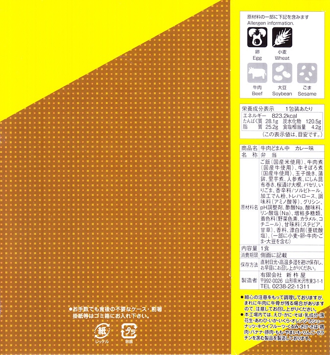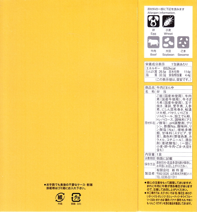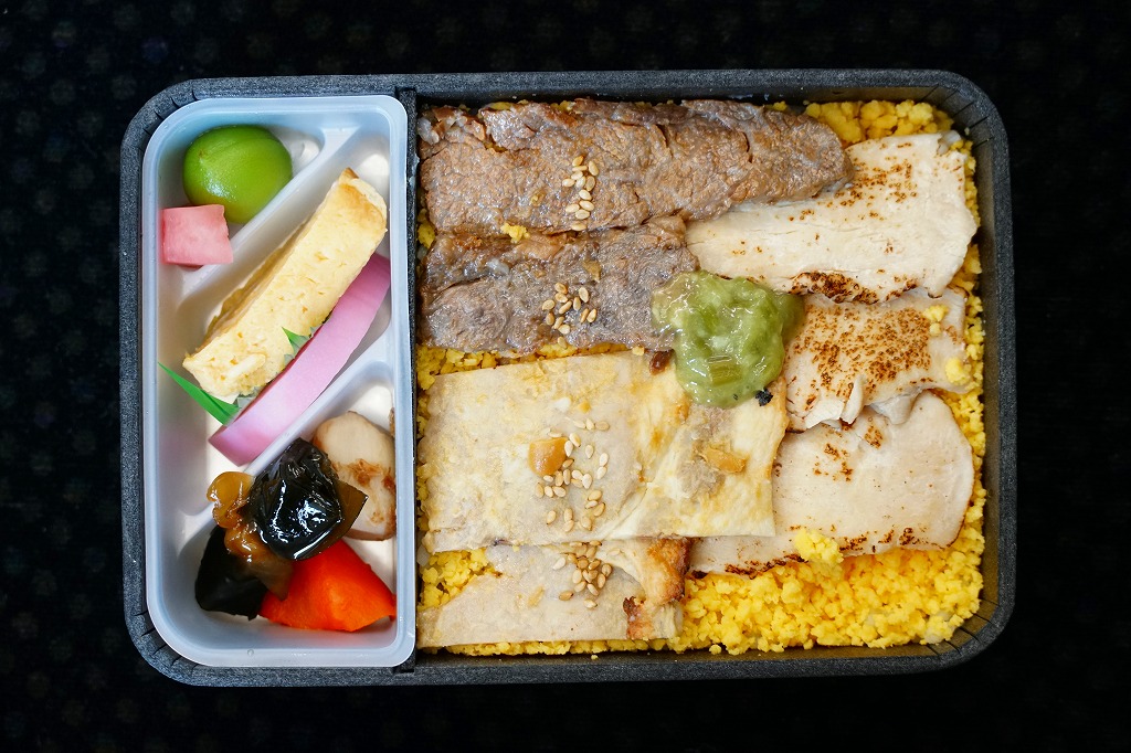 人気の駅弁「牛肉どまん中」と同じ形をした黒いプラ容器を、表面に新幹線電車を、底面におしながきと年表「山形新幹線30年のあゆみ」を記したスリーブに収める。中身は白飯を玉子そぼろで覆い、米沢牛の秘伝タレの焼肉、天元豚の西京焼き、山形さくらんぼ鶏の特製塩ダレの蒸し焼き、つまり牛豚鶏の焼肉を載せ、煮物、玉子焼、かまぼこ、赤かぶ、若桃の甘露煮を添えるもの。肉三昧を名乗るには肉の量が足りなくても、「牛肉どまん中」の250円増しで済み、そもそも期間限定の記念駅弁だから賑やかでよい。