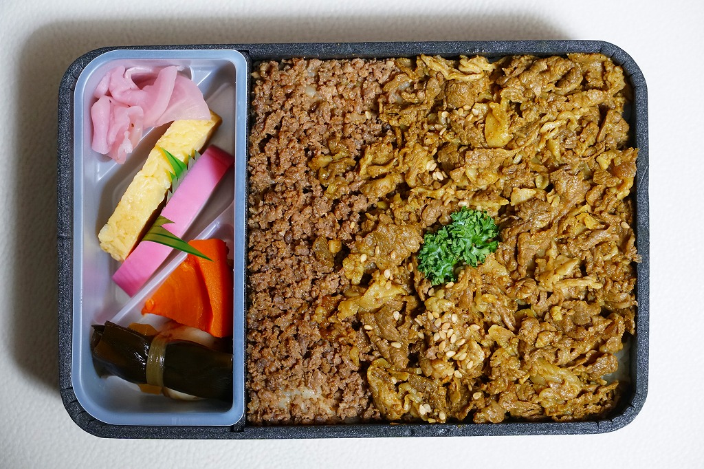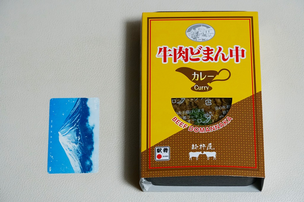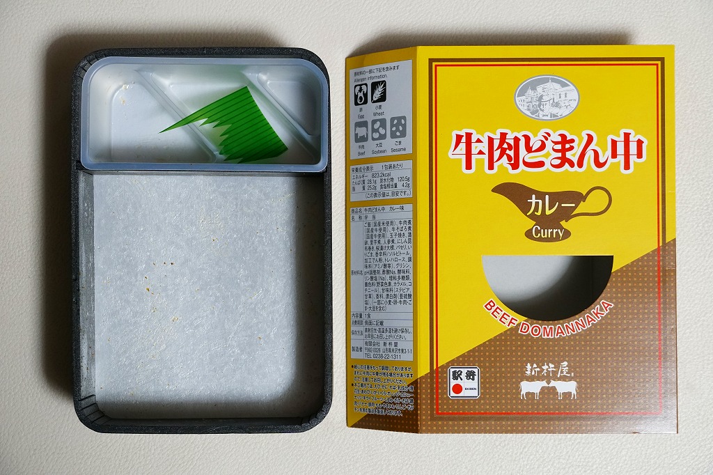 2015(平成27)年9月の発売。その前の8月8日に、東京駅の駅弁売店「駅弁屋 祭」でデビュー。醤油味(通常版)、しお味、みそ味に続く、4種類目の「牛肉どまん中」。白飯を覆う牛肉煮と牛そぼろとカレー粉で味付け、パセリで彩り、かまぼこ、玉子焼、サトイモ、にんじん、にしん昆布巻、大根桜漬を付け合わせる。駅弁に関する過去の文献から、肉駅弁のカレー味は臭み消しという先入観があるため、味に定評のあるこの駅弁でのこの味はもったいないと思うところだが、肉の味が残る程度に淡い風味付けで、味は守られている。