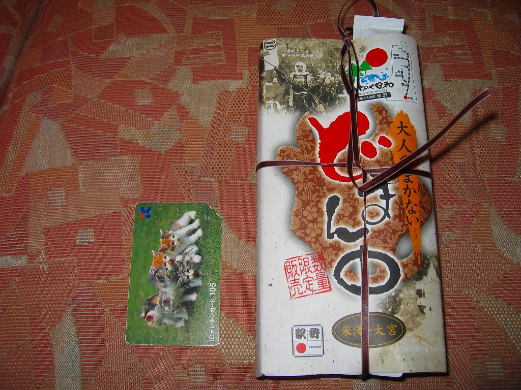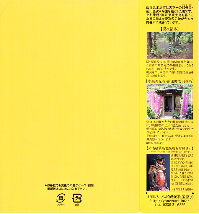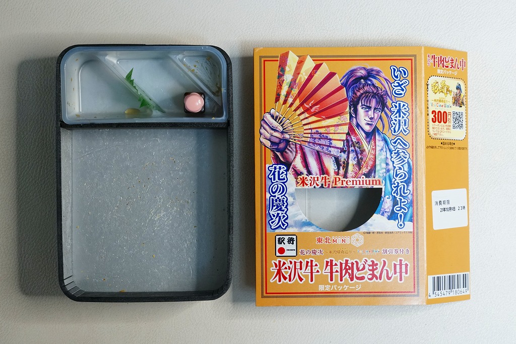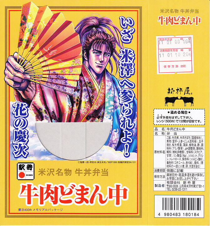 2011(平成23)年1月10日に購入した、米沢駅弁のスリーブ。米沢ゆかりの戦国武将である前田慶次の400年忌にちなむ記念事業の一環として、2011年1月から6月頃までこのパッケージを採用した。パッケージ表面下部にも「慶次400thメモリアルパッケージ」と書かれている。中身や価格は普段と変わらない。これに描かれたキャラクターそのものは、1990年代に集英社の漫画雑誌「週刊少年ジャンプ」で連載された「花の慶次」の主人公。1980年代に社会現象となった「北斗の拳」と同じく、原哲夫氏の作画による。