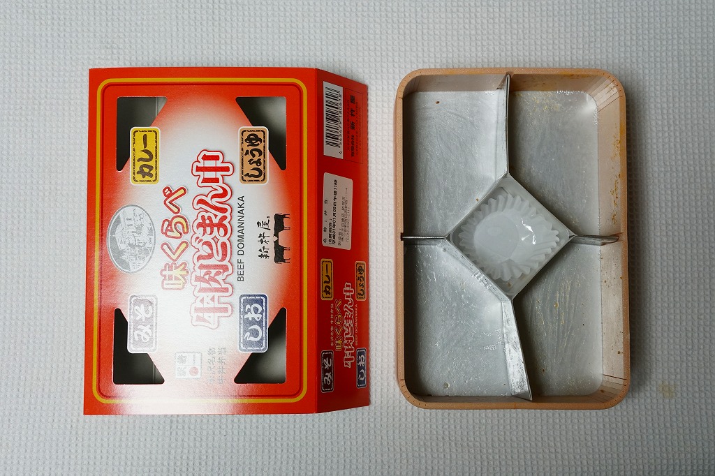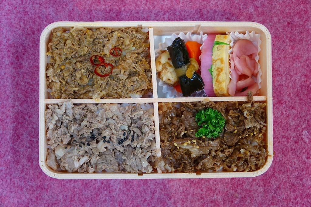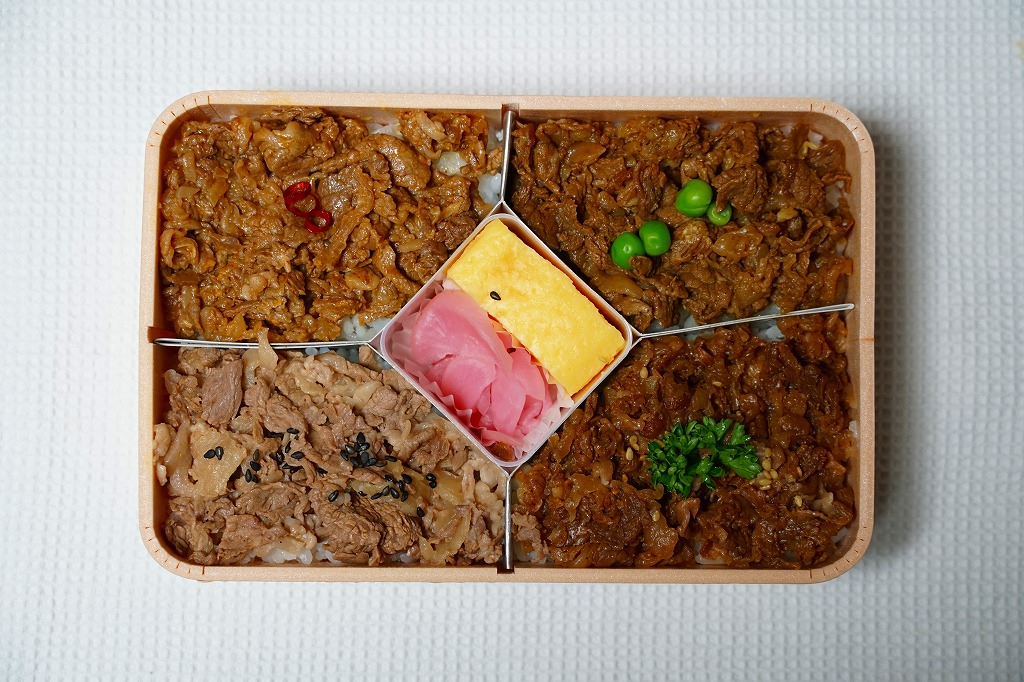 2019(平成31)年1月の京王百貨店の駅弁大会での実演販売で生まれた駅弁。3年前の「三味牛肉どまん中」では、「しょうゆ(通常版)」「しお」「みそ」の3種の牛肉どまん中を入れたが、今回は「カレー」を加えて4種の牛肉どまん中を詰め合わせた。玉子焼と大根桜漬の付合せはセンターに配置。催事場内ではそこそこの人気を得ていたと見えた。以後も米沢駅前の調製元での注文販売で入手できた。1年間ほどの販売か。