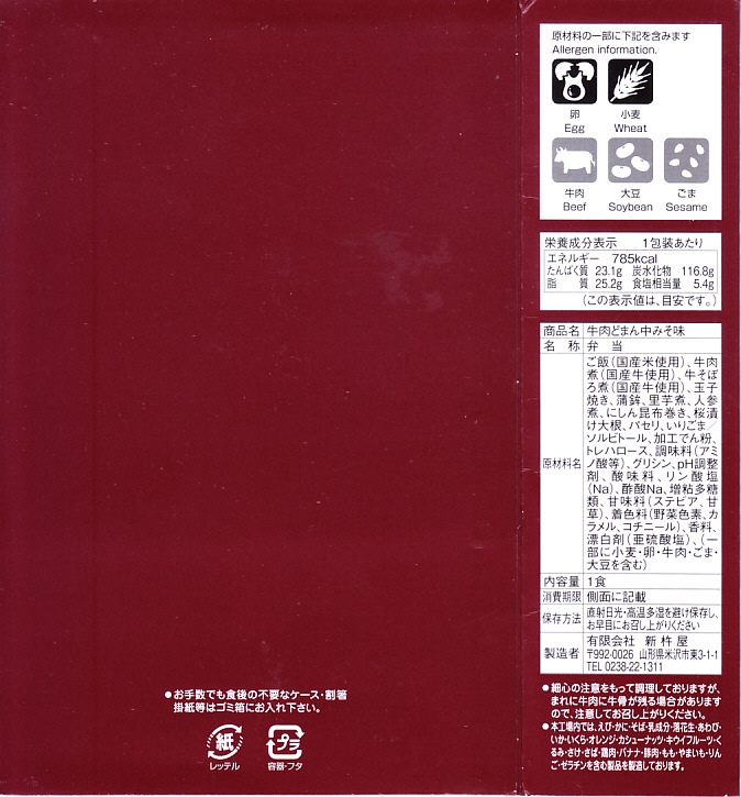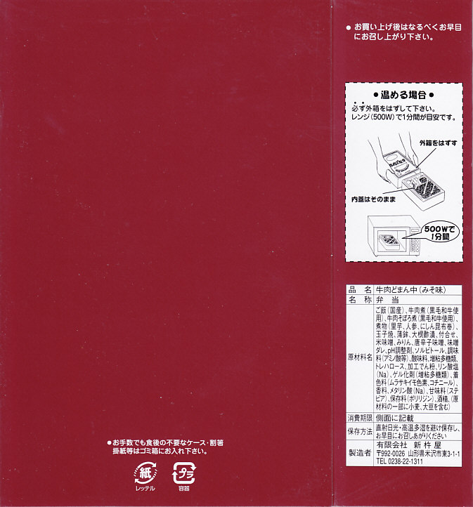 2016(平成28)年9月16日に購入した、米沢駅弁のスリーブ。上記の2018年のものと同じにみえて、容器側面の注意書きが少し違う。