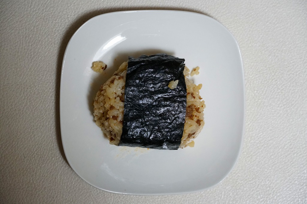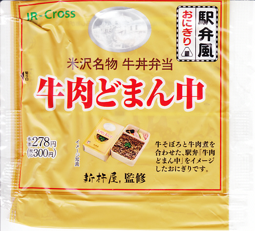 袋の絵柄は牛肉どまん中のスリーブに似せ、本物の見本写真も掲載。牛そぼろ入り御飯に牛肉煮を載せて海苔で巻いたものを1個袋詰め。確かにその風味と内容は、牛肉どまん中になんとなく似ていた。本物にはミニサイズがないので、こんなコンビニおにぎりが米沢駅などにあってもよいと思う。