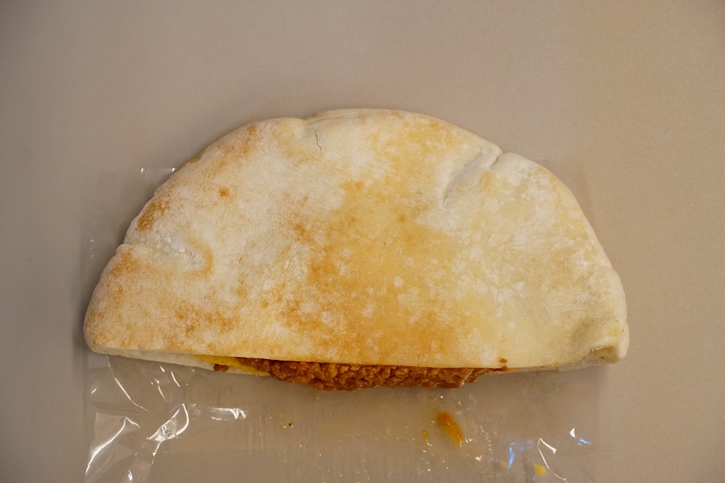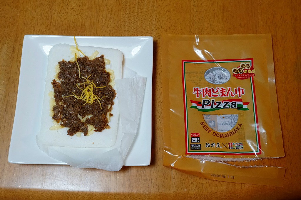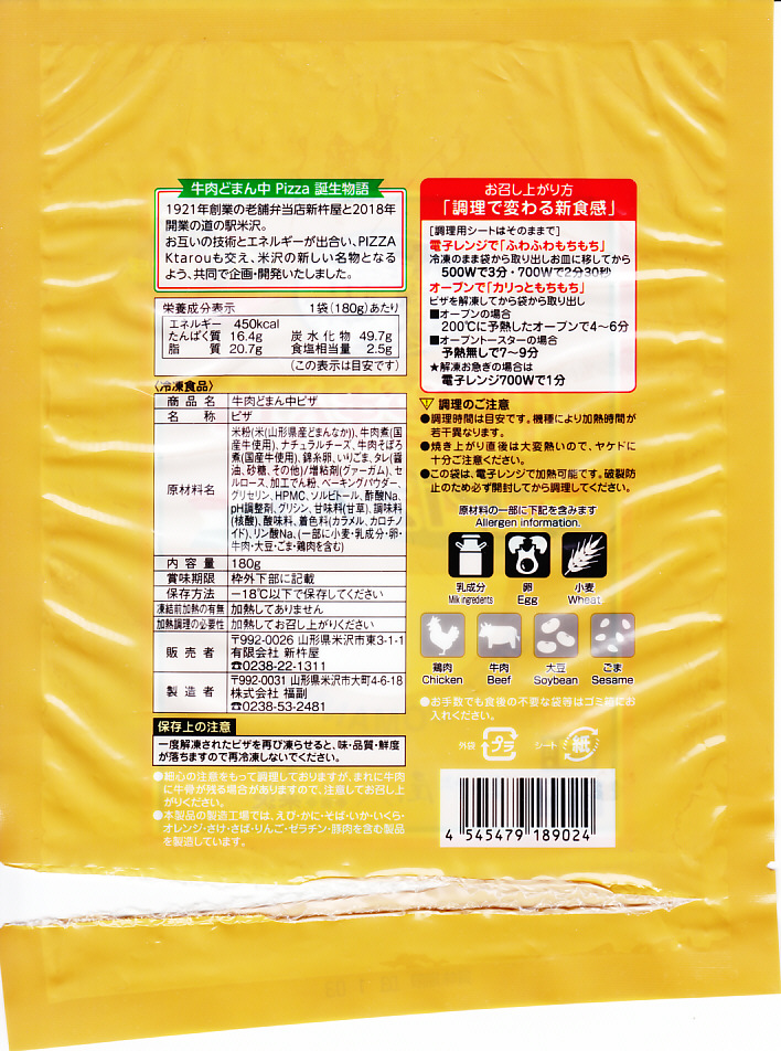 山形米「どまんなか」の米粉を100%使う白く四角い生地に、牛そぼろとチーズを載せて、駅弁の牛肉どまん中に似た絵柄の袋に詰めて冷凍する。自然解凍の状態でいただくと、ふんわりしっとりした生地に味の濃い具が合った。分量に比して高額な印象はある。製造者は米沢市街の持ち帰りピザ屋「PIZZA Ktarou」。