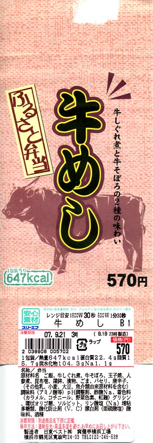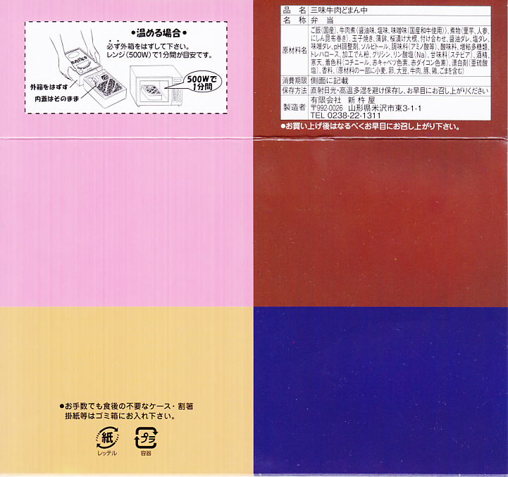 中堅コンビニエンストアチェーンのスリーエフが、2007(平成19)年9月12日から25日まで販売したコンビニ弁当。全国の人気駅弁をモチーフにした2週替わり弁当6種の第一弾で、米沢のものを参考にしたという。参考品の具体名は出ていないが、おそらく「牛肉どまん中」だろう。