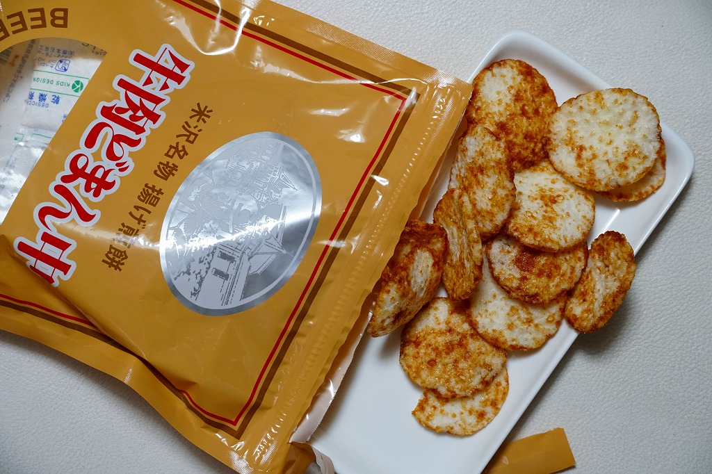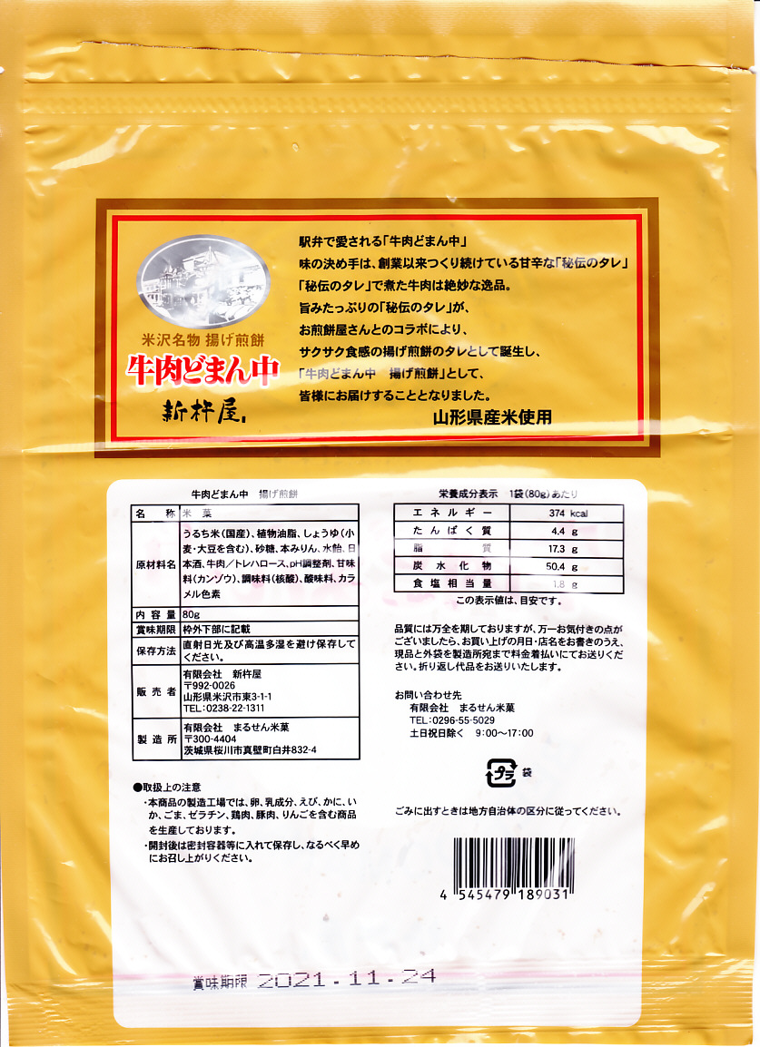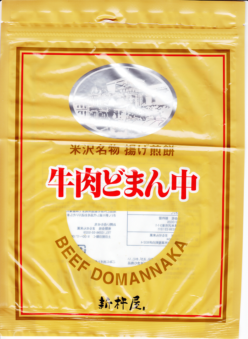 2021(令和3)年4月に新発売。米沢駅弁の調製元と茨城県真壁の米菓製造販売業者との共同開発商品。米沢駅と日本を代表する有名な駅弁「牛肉どまん中」を揚げ煎餅にした。その袋の絵柄は駅弁のスリーブと同じで、よく見ると「米沢名物牛丼弁当」の箇所を「米沢名物揚げ煎餅」に書き換える。中身は小粒の揚げ煎餅。牛肉どまん中の調製で牛肉を煮たタレと山形県産のお米を使うというが、味は普通のスーパーで買える普通の揚げ煎餅と変わらない。小粒で固くなく食べやすいとは思う。価格は2021年時点で350円、2022年時点で380円。